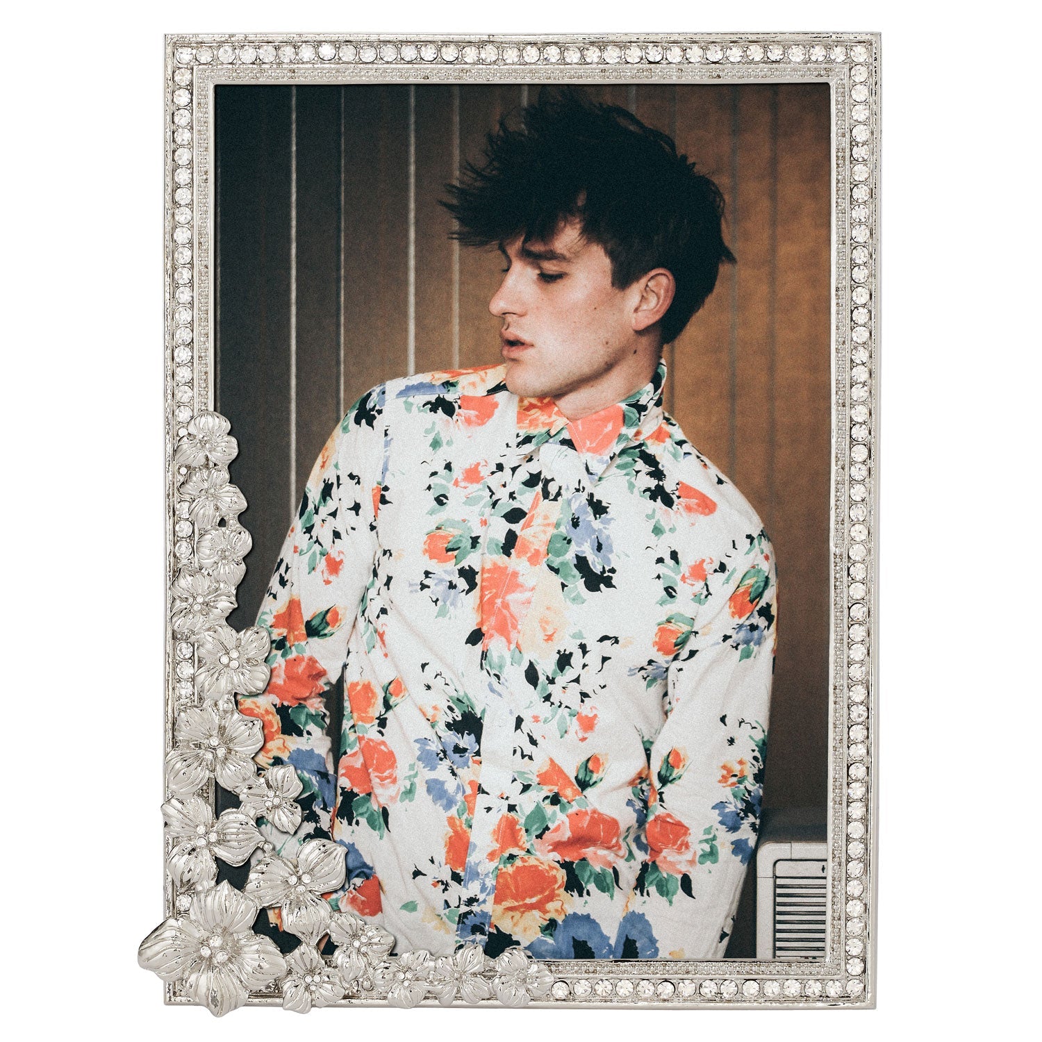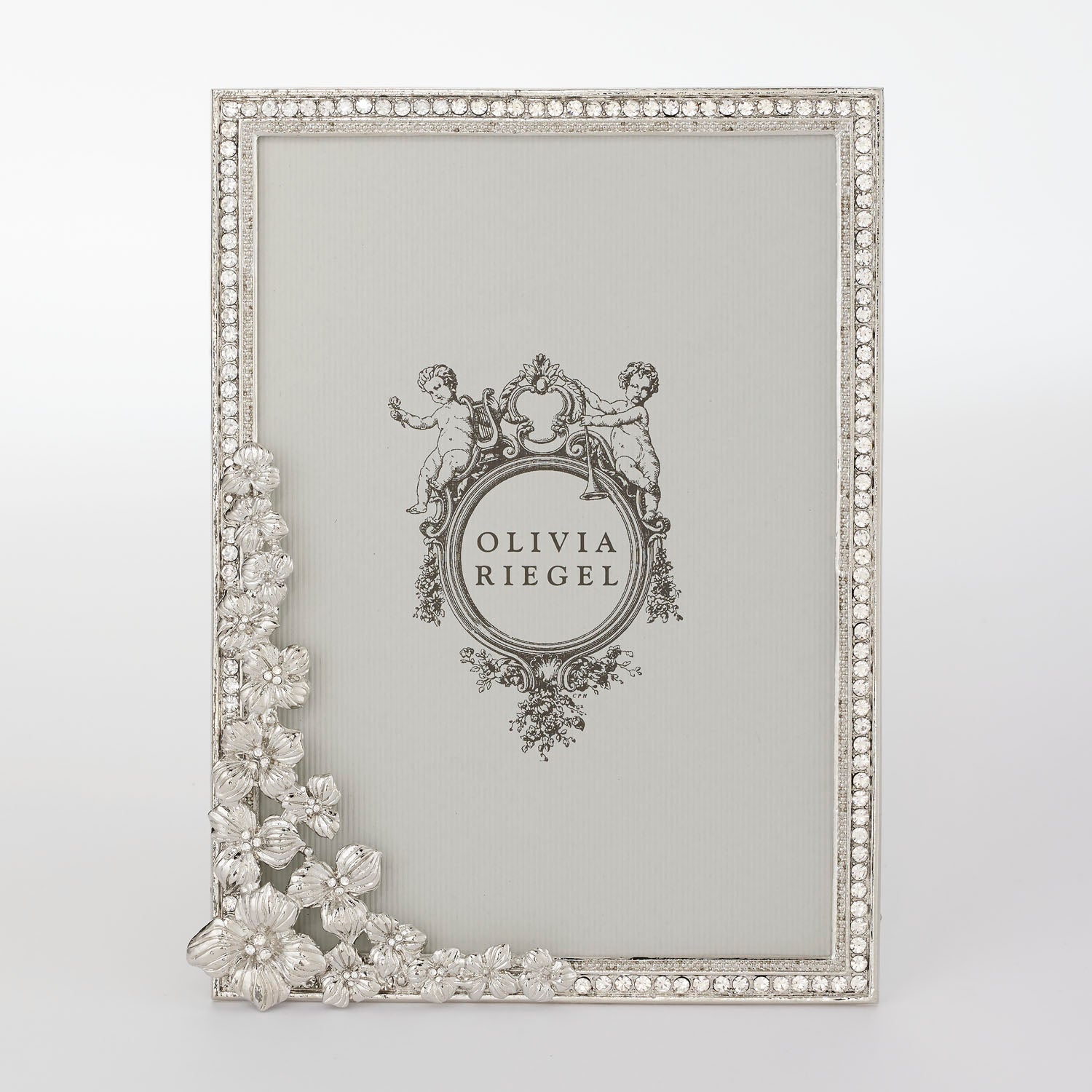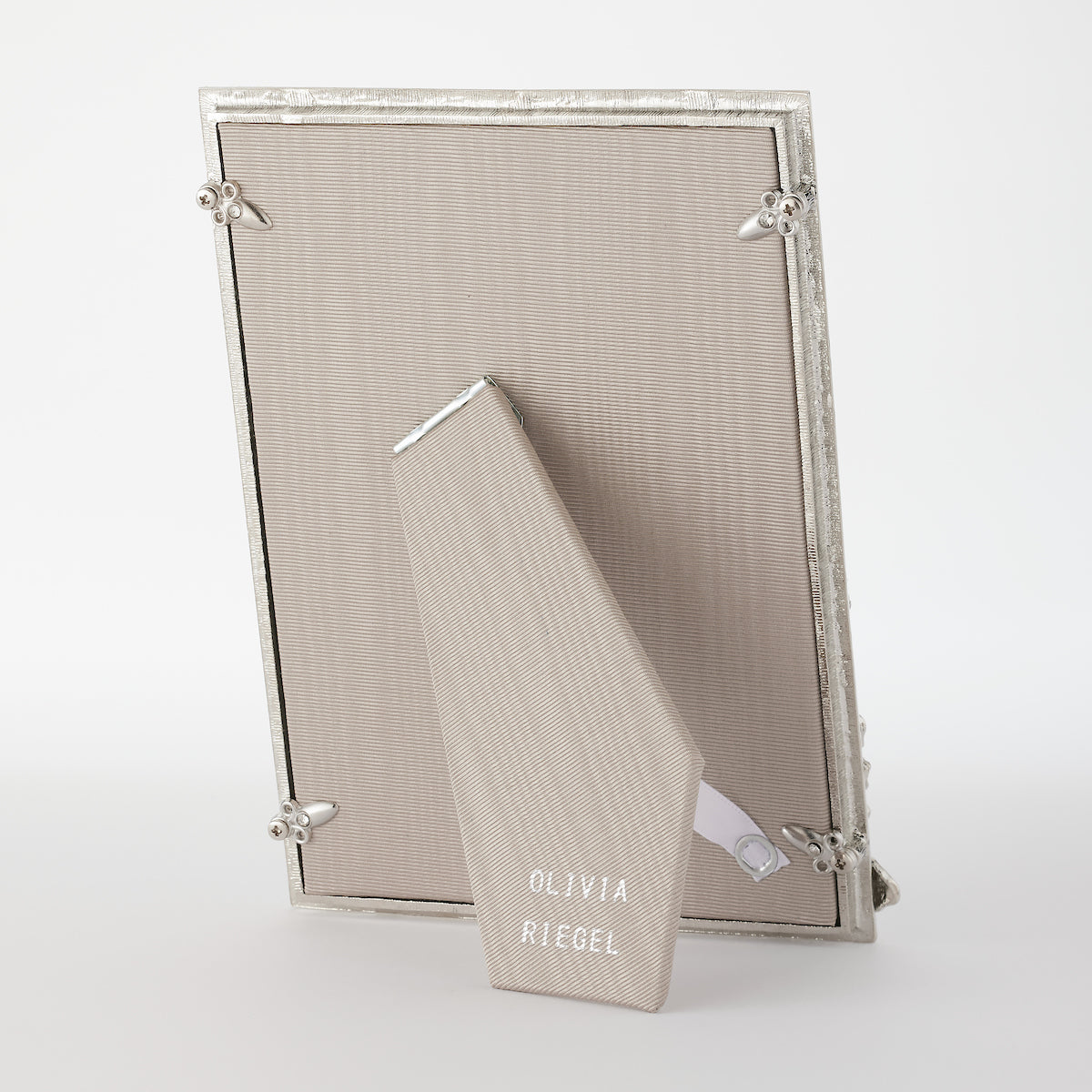 Gold or silver finished pewter picture frame in a floral pattern, encrusted with hand-set clear European crystals. Elegant moiré silk back, with easel designed for vertical or horizontal placement. Beveled glass. Tarnish resistant. Signature luxury gift box included.