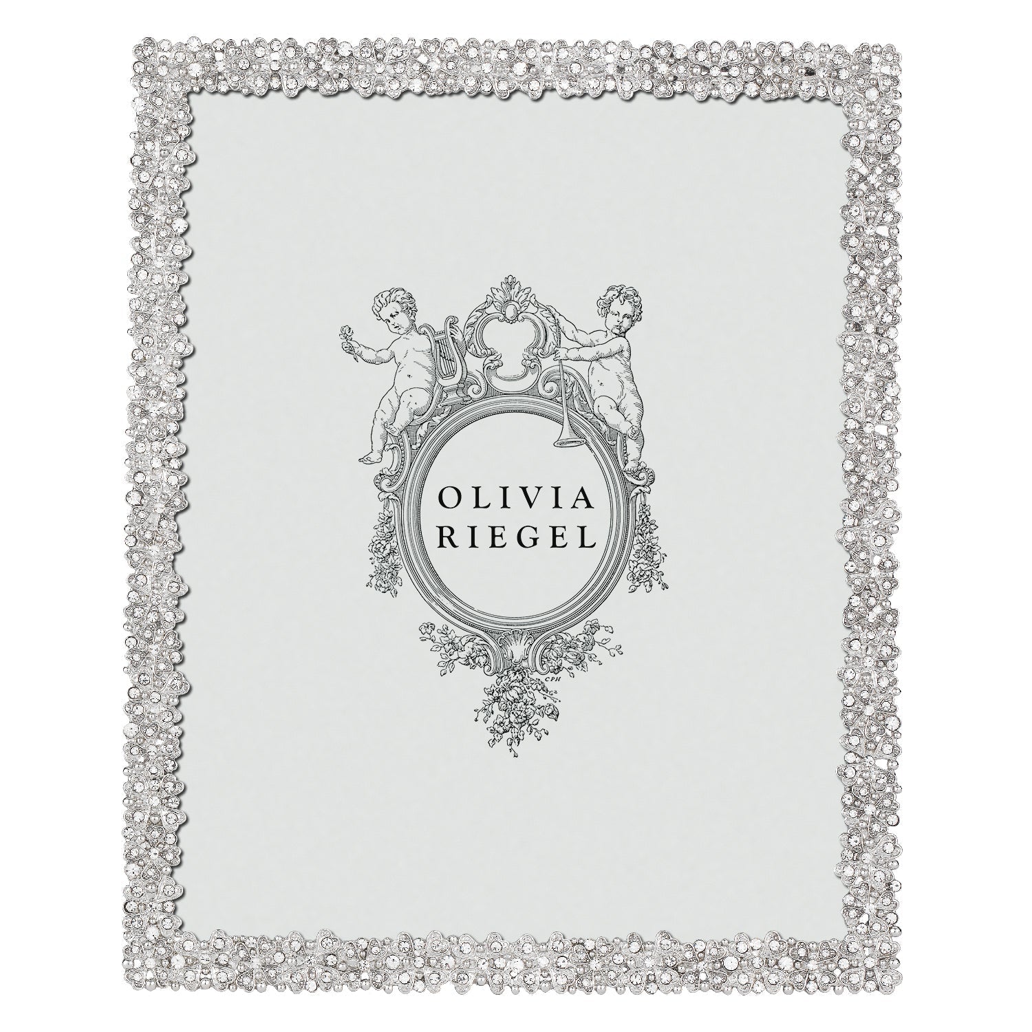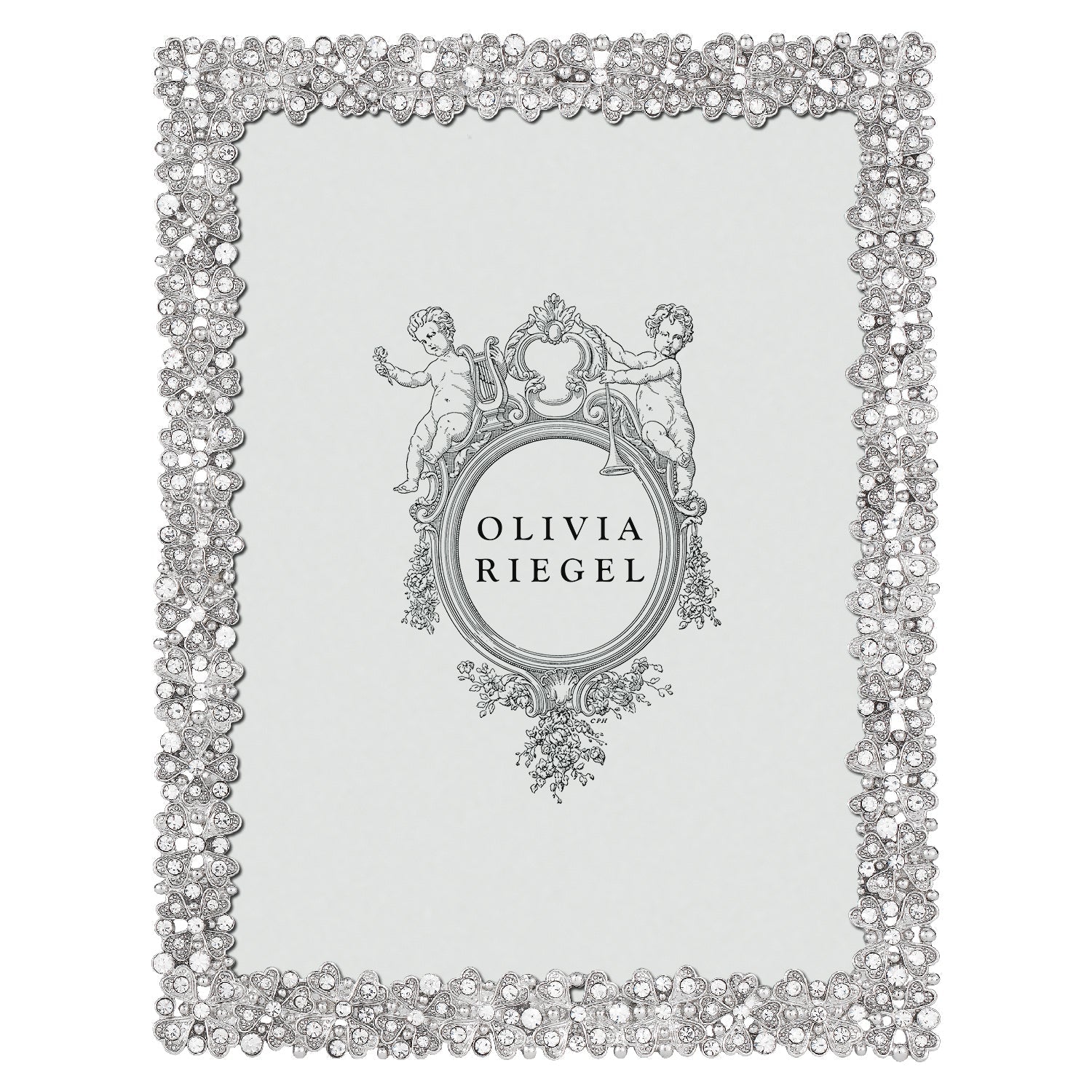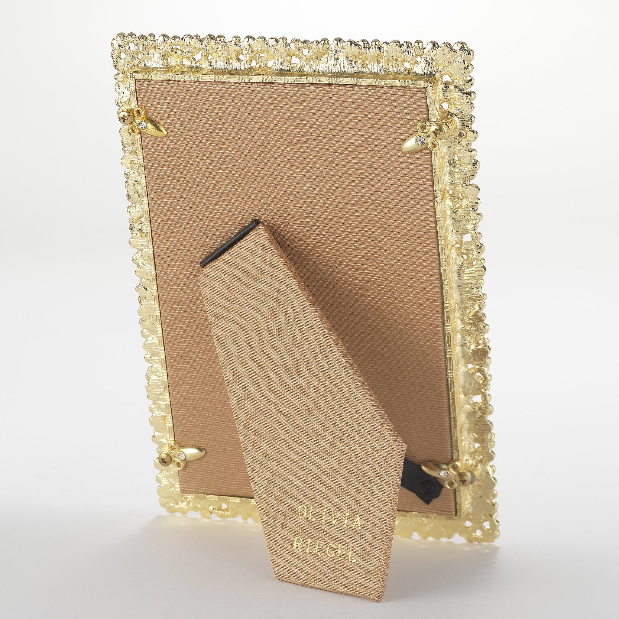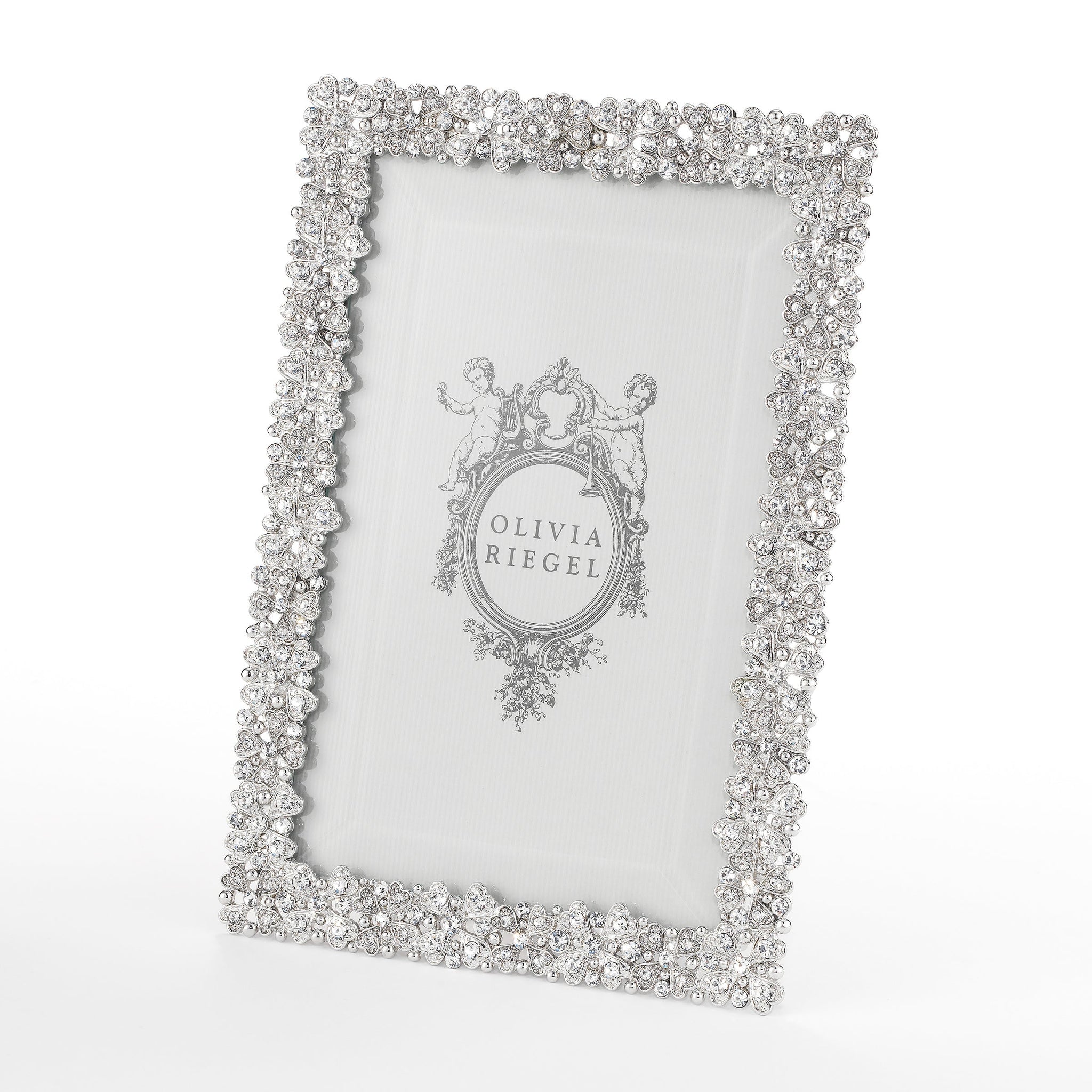 Gold or silver finished pewter picture frame with hand-set clear European crystals. Beveled glass. Elegant moiré silk back, with easel designed for vertical or horizontal placement. Tarnish resistant. Signature luxury gift box included.