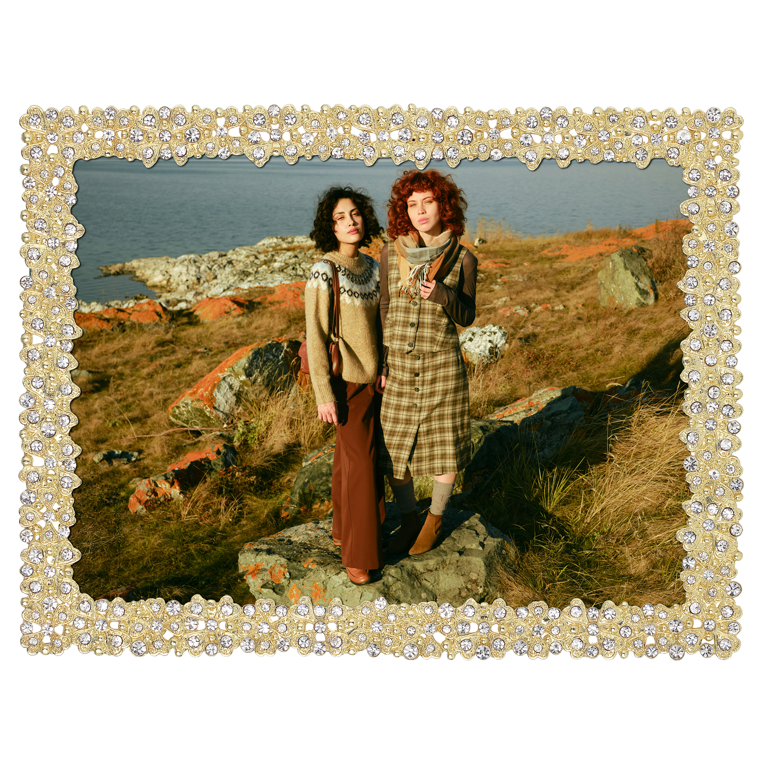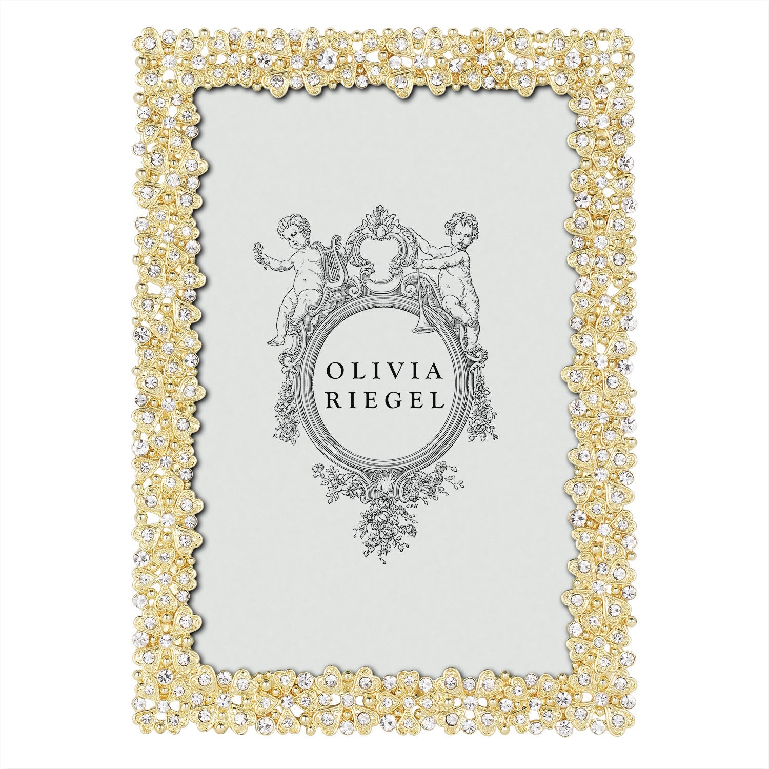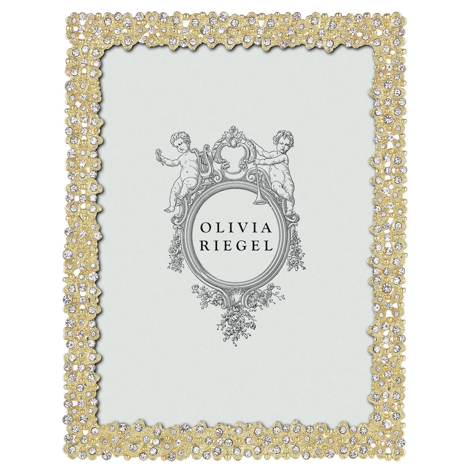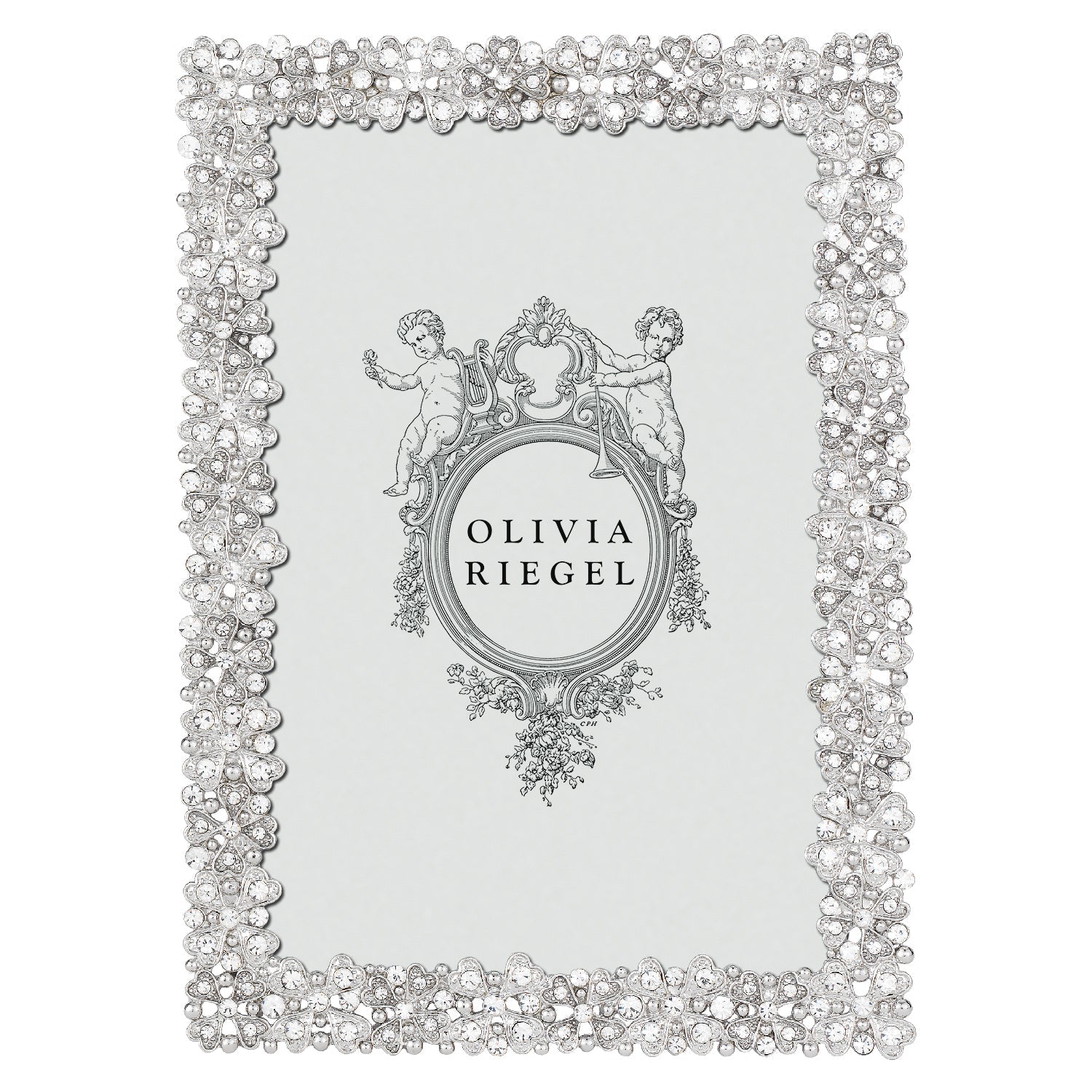 Gold or silver finished pewter picture frame with hand-set clear European crystals. Beveled glass. Elegant moiré silk back, with easel designed for vertical or horizontal placement. Tarnish resistant. Signature luxury gift box included.