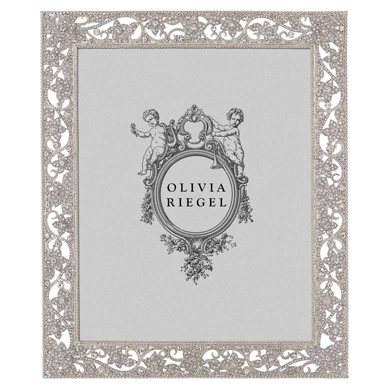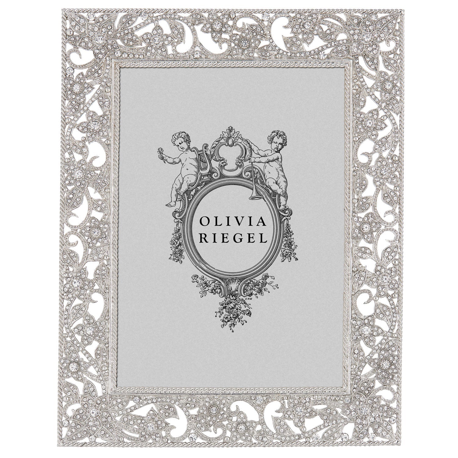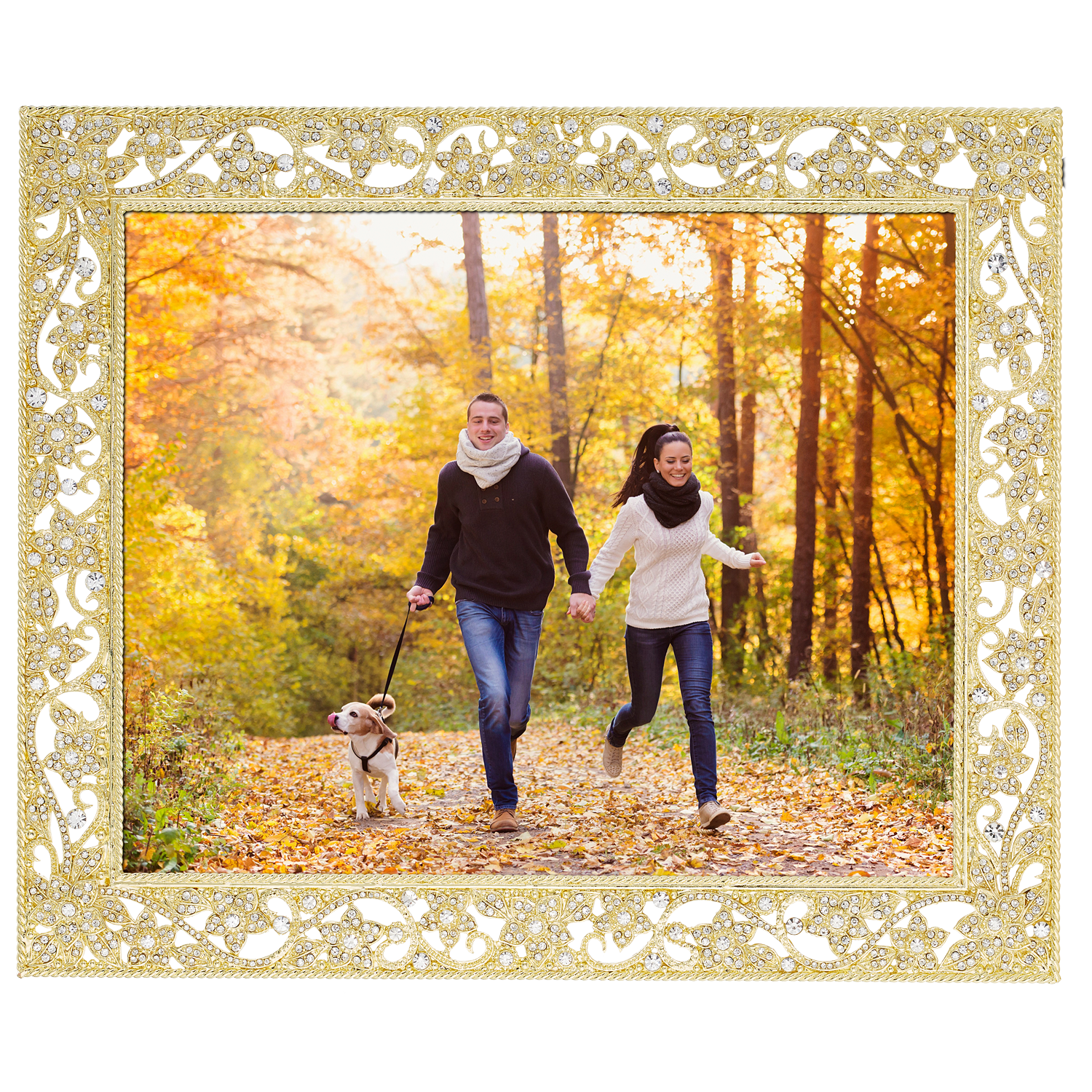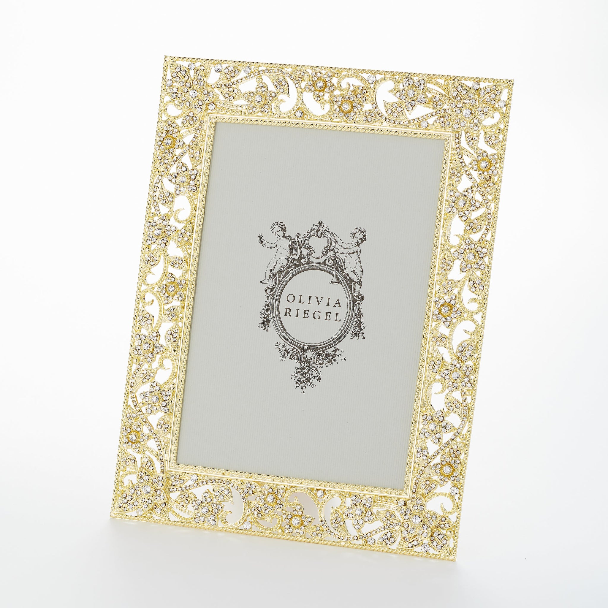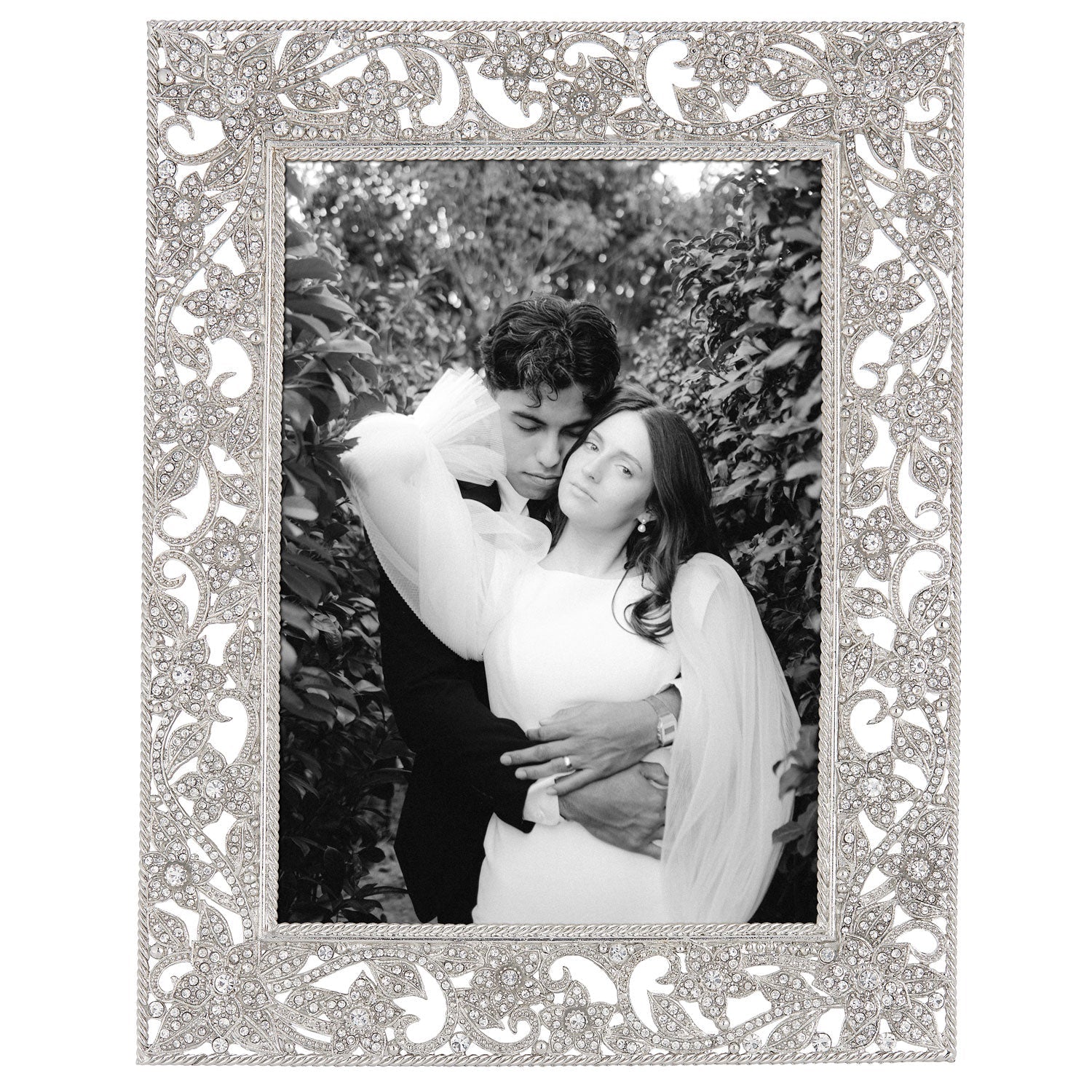 Gold or silver finished pewter floral patterned picture frame, richly encrusted with hand-set clear European crystals. Elegant moiré silk back, with easel designed for vertical or horizontal placement. Beveled glass. Tarnish resistant. Signature luxury gift box included.