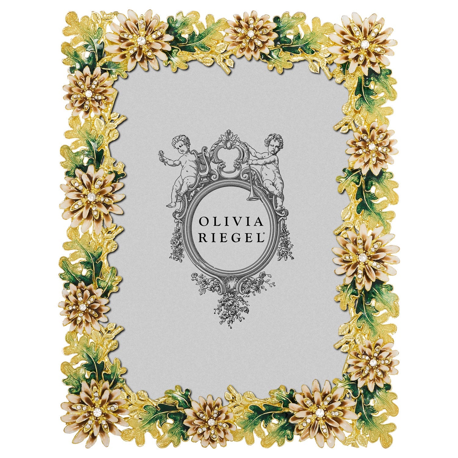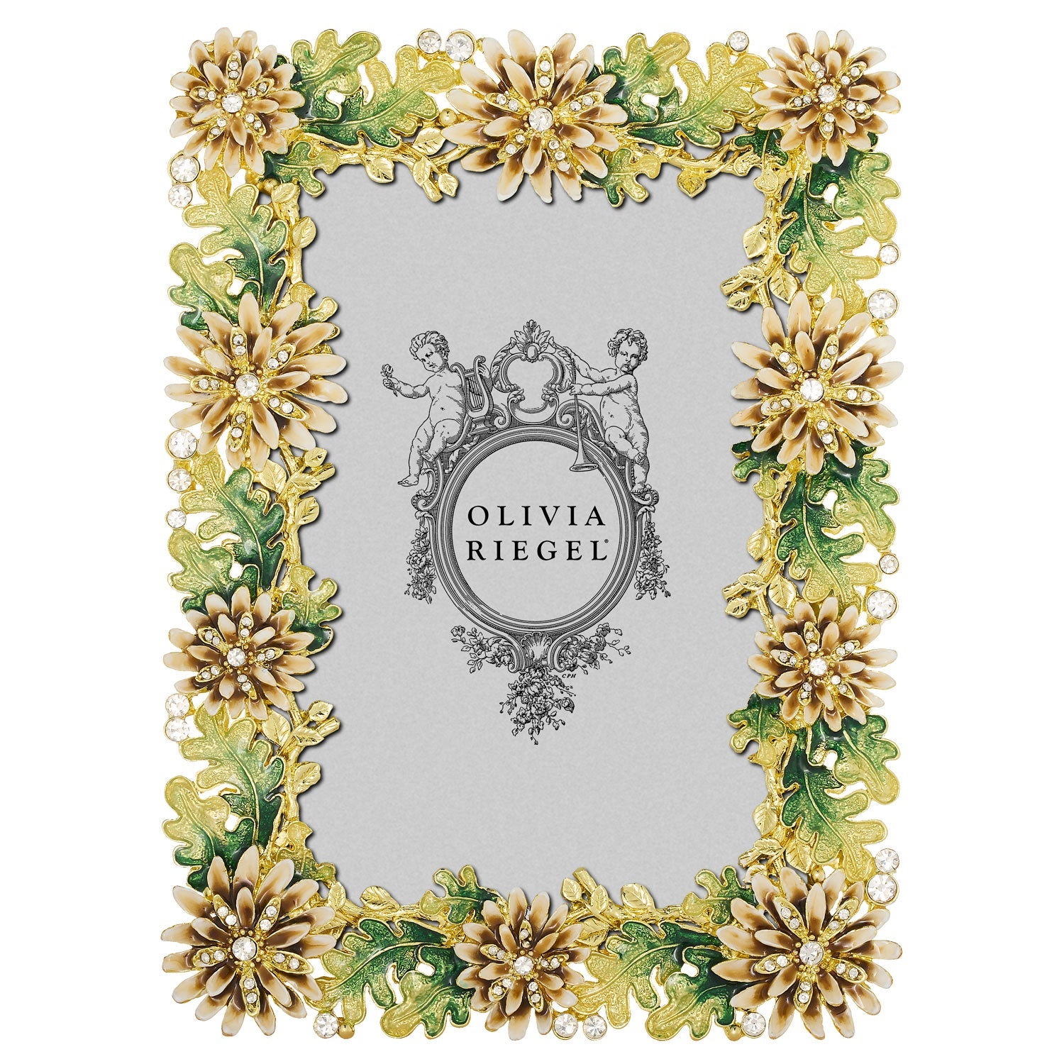 Graceful old world floral designed picture frame, featuring gold finished pewter blossoms and leaves, intricately hand-enameled in soft and neutral tones. Hand-set clear European crystals. Elegant champagne moiré silk back, with easel for vertical or horizontal placement. Tarnish resistant. Signature luxury gift box included.