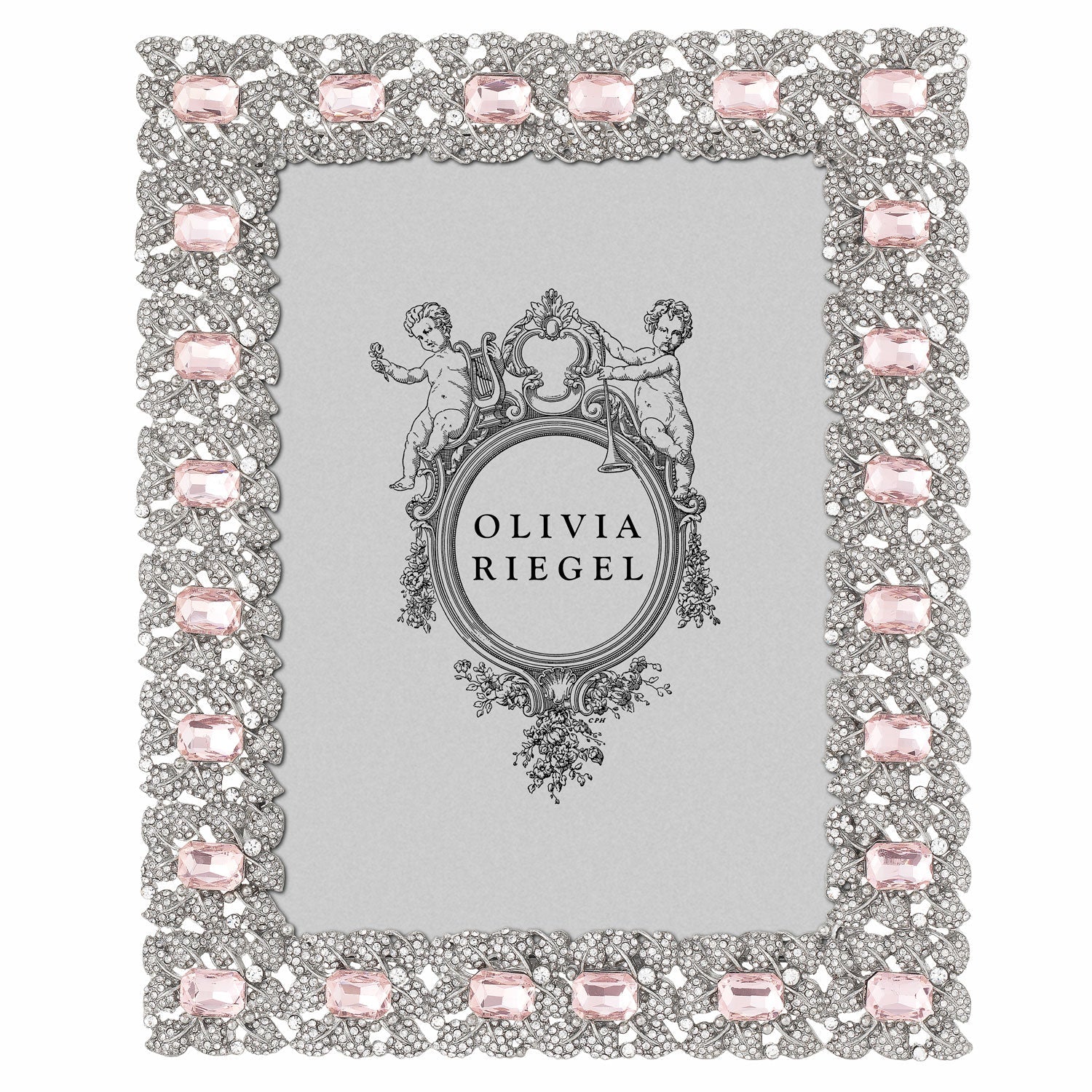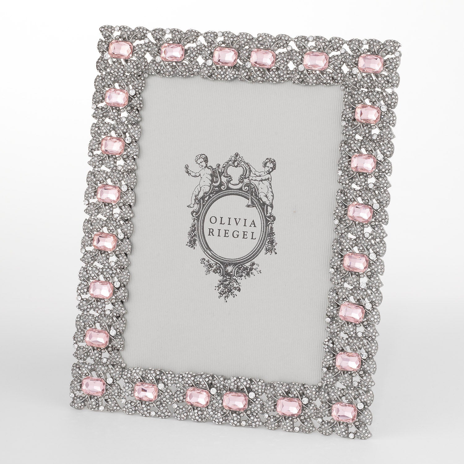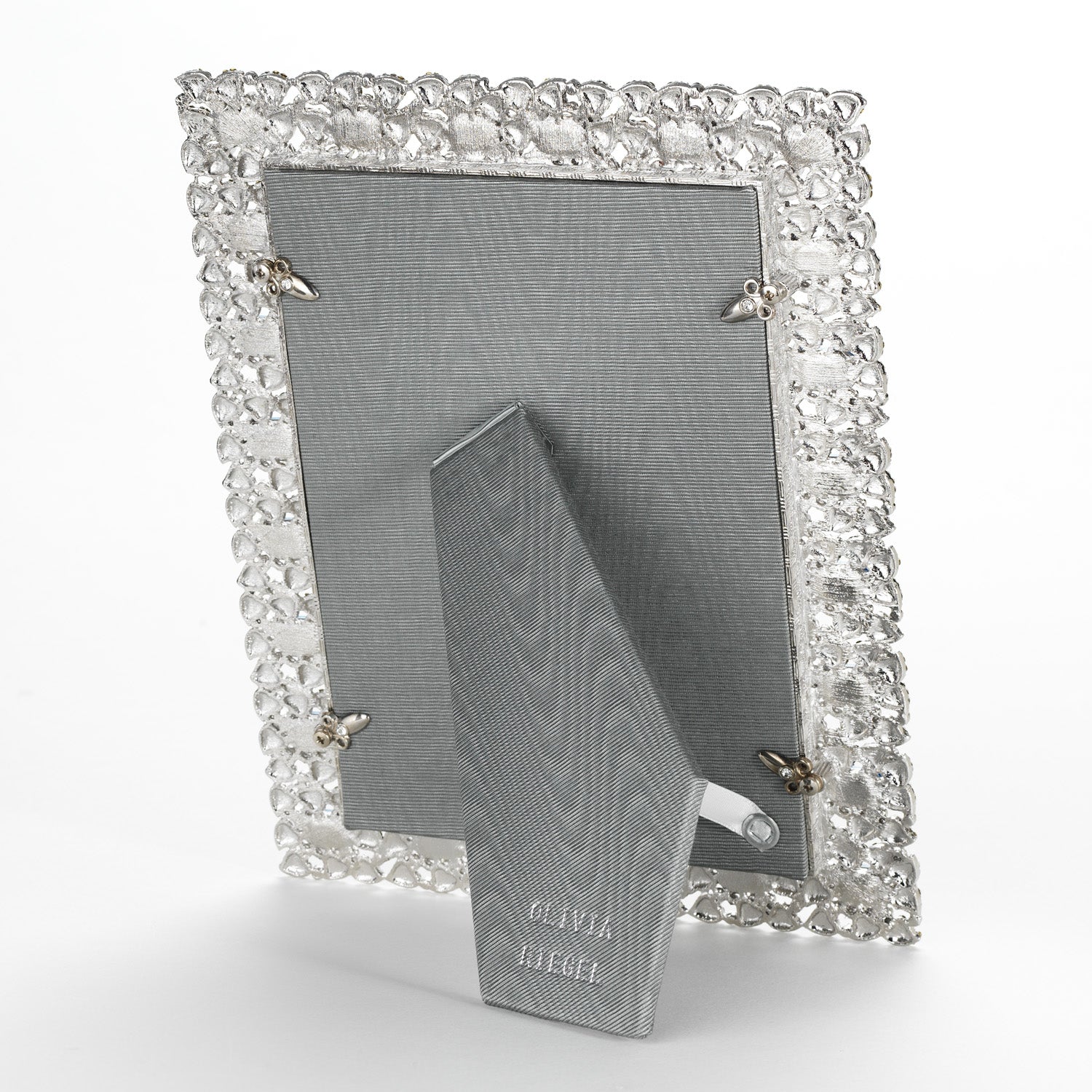 Silver finished pewter picture frame, encrusted with hundreds of hand-set clear pavé European crystals and rose faceted glass gems. Beveled glass. Elegant gray moiré silk back. Tarnish resistant. Signature luxury gift box included.