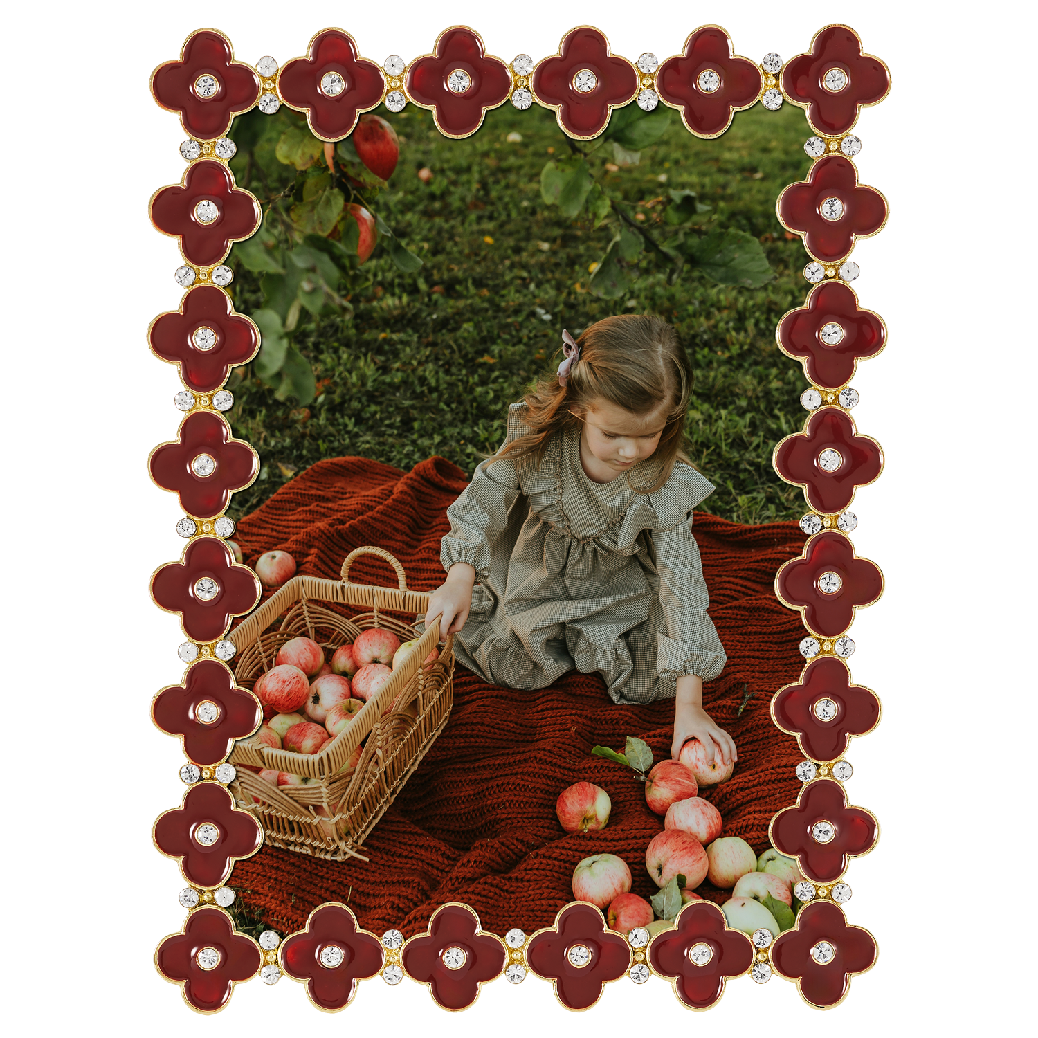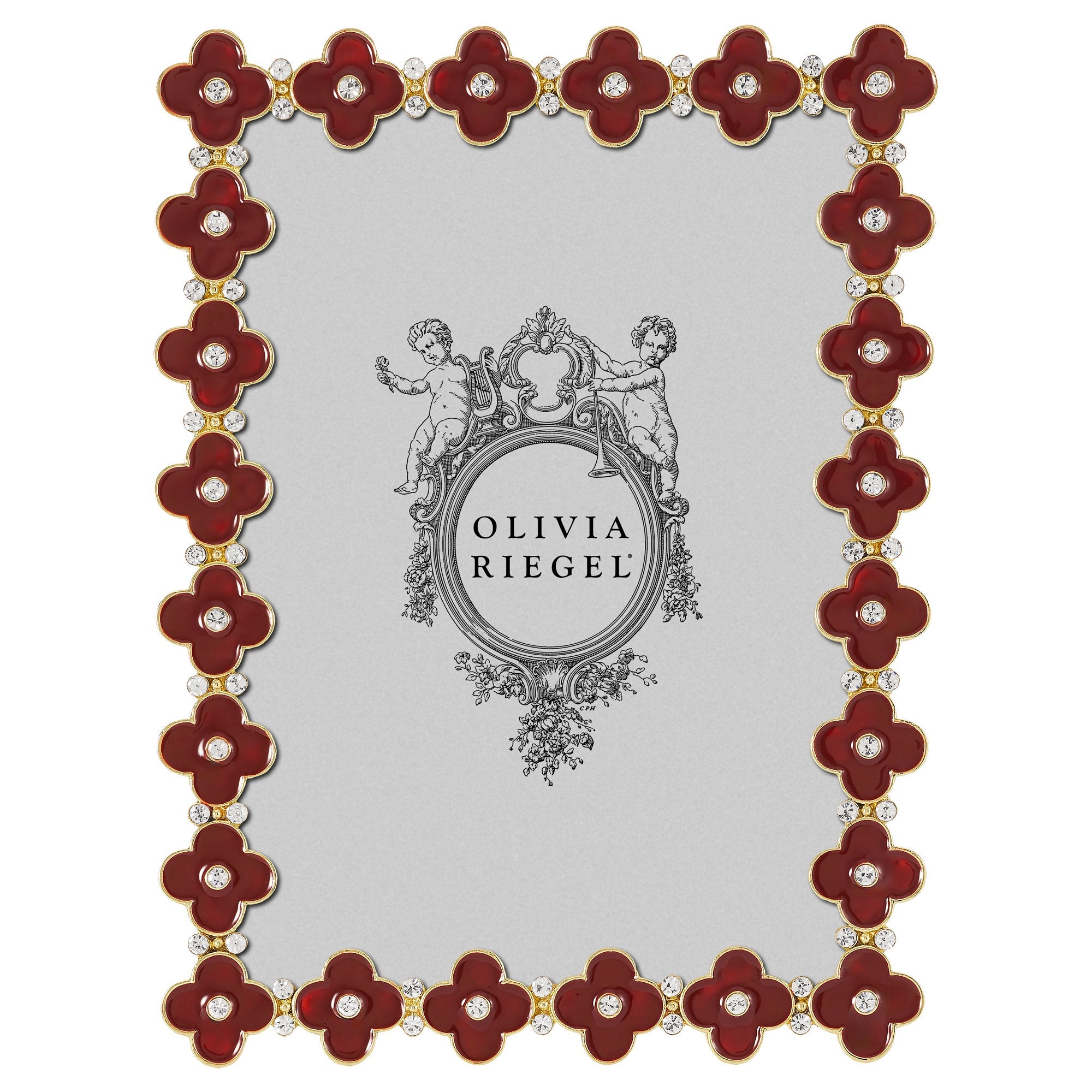 Inspired by the historic quatrefoil design—a decorative element utilized in architecture and the arts for millennia. Gold finished pewter picture frame, adorned with crimson hued hand-enameling and hand-set clear European crystals. Elegant moiré silk back, with easel designed for vertical or horizontal placement. Tarnish resistant. Signature luxury gift box included.