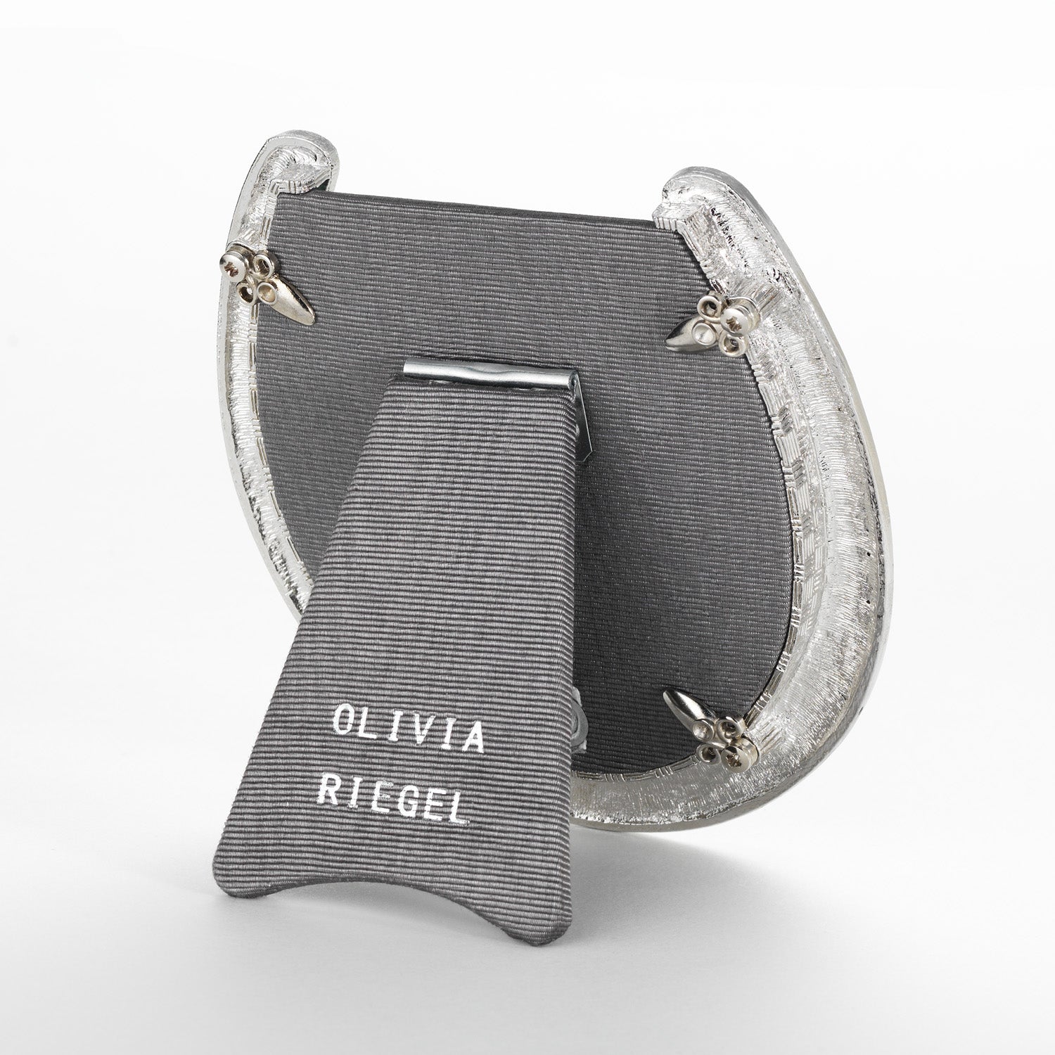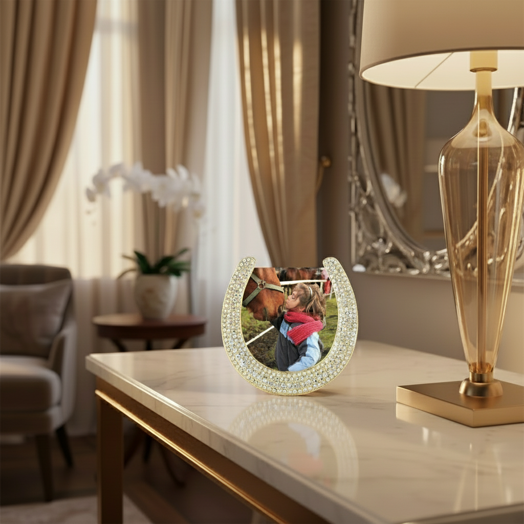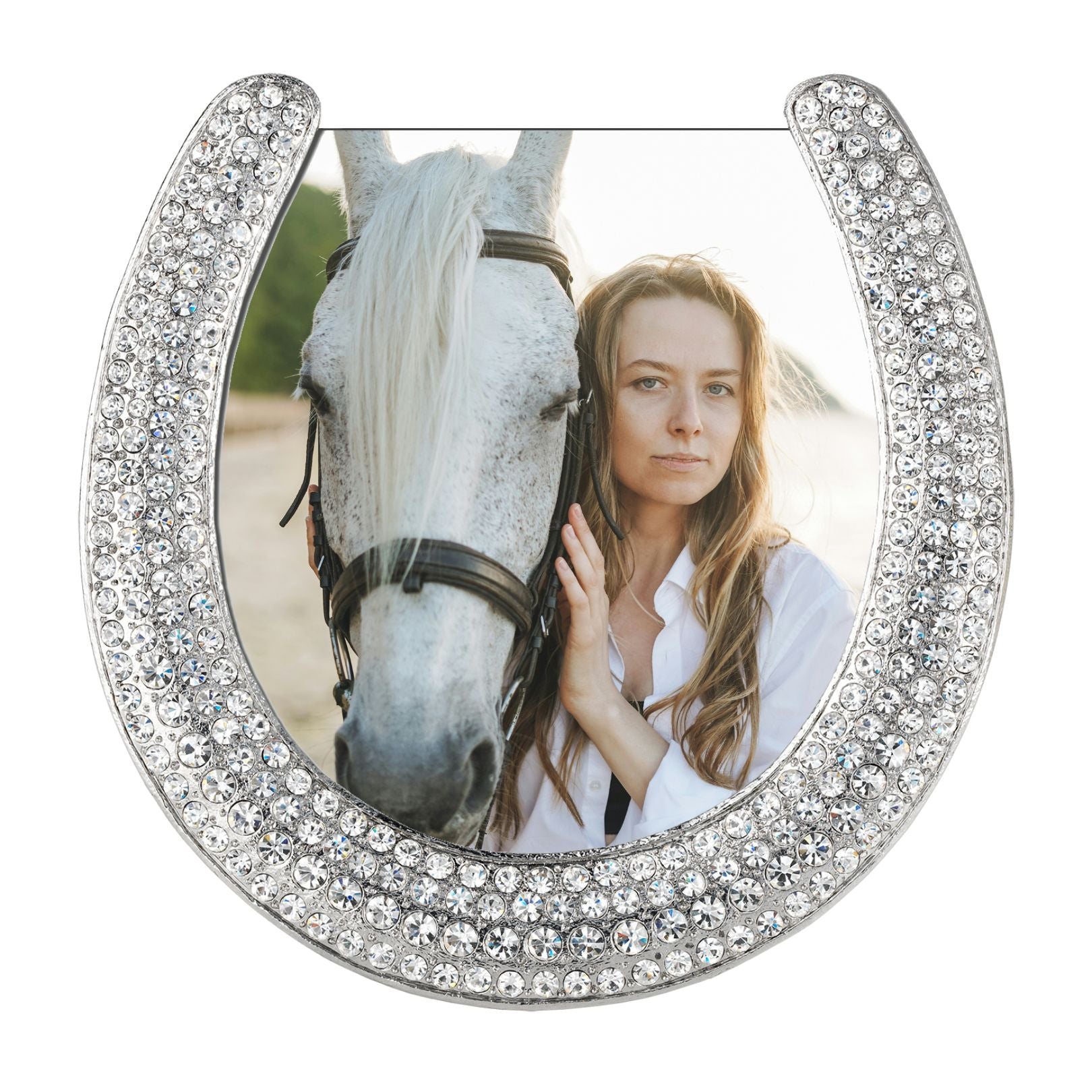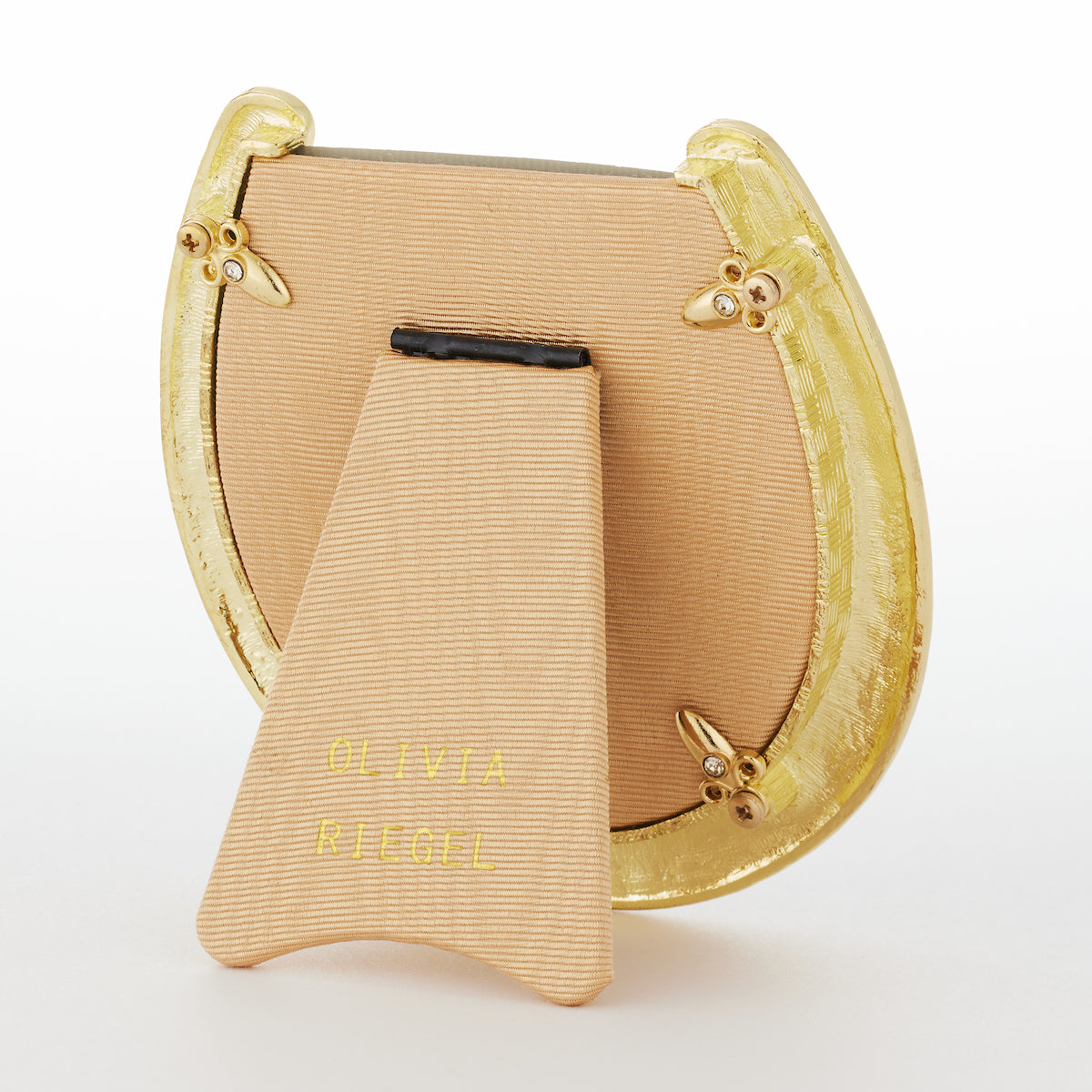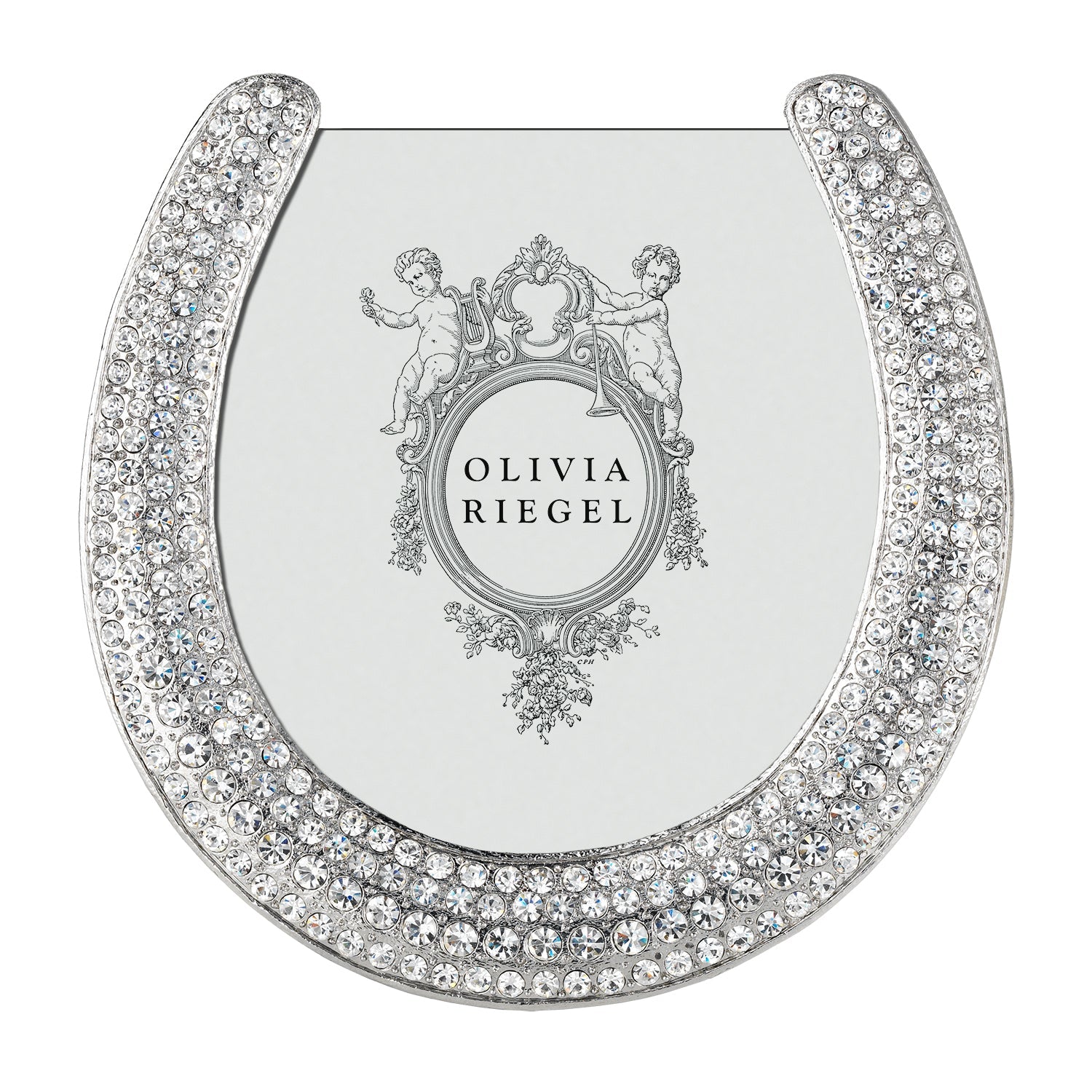 Spread joy and spark luck with a glamorous gold or silver finished pewter horseshoe picture frame. Encrusted with hand-set clear pavé European crystals. Moiré silk back. Tarnish resistant. Signature luxury gift box included.