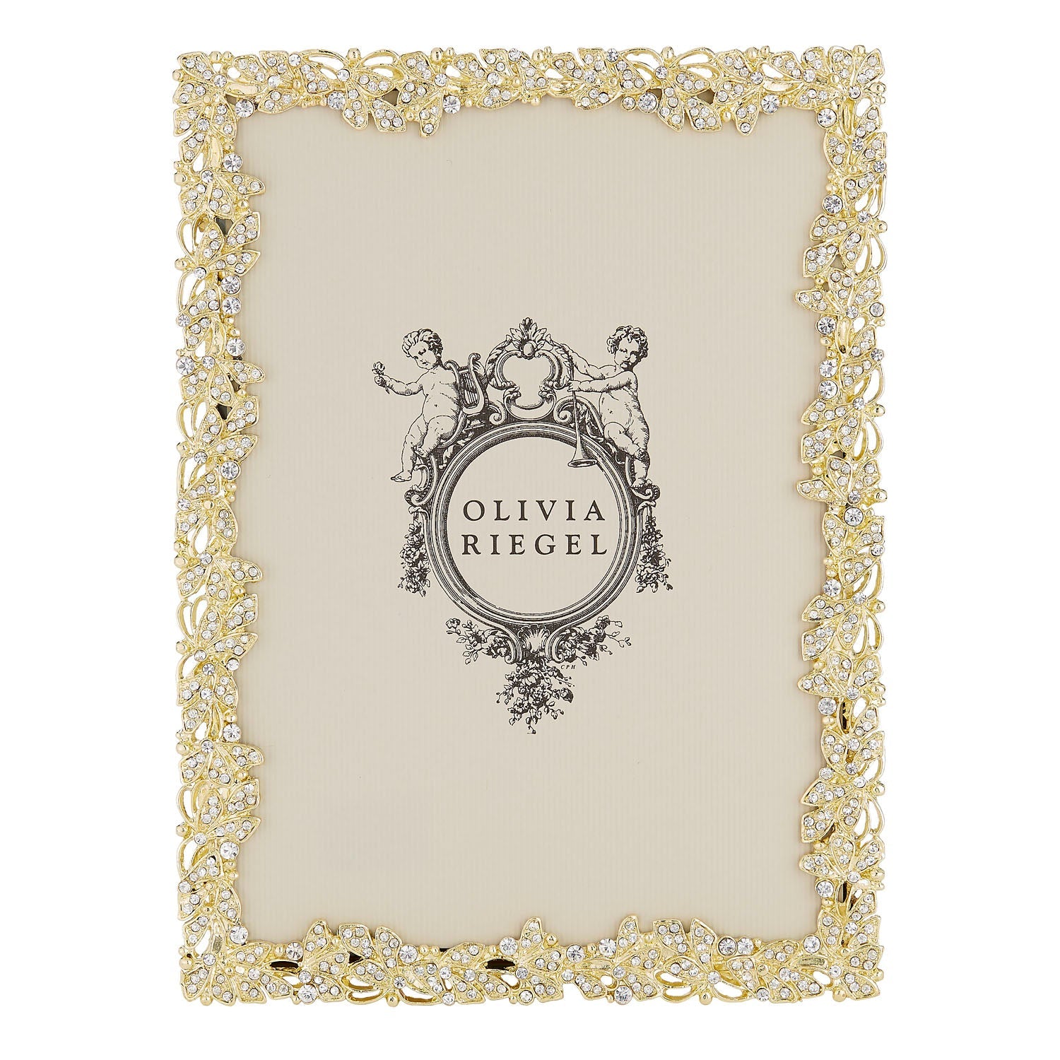 Gold finished pewter picture frame, encrusted with hand-set clear European crystals. Elegant champagne hued moiré silk back, with easel designed for vertical or horizontal placement. Beveled glass. Tarnish resistant. Signature luxury gift box included.