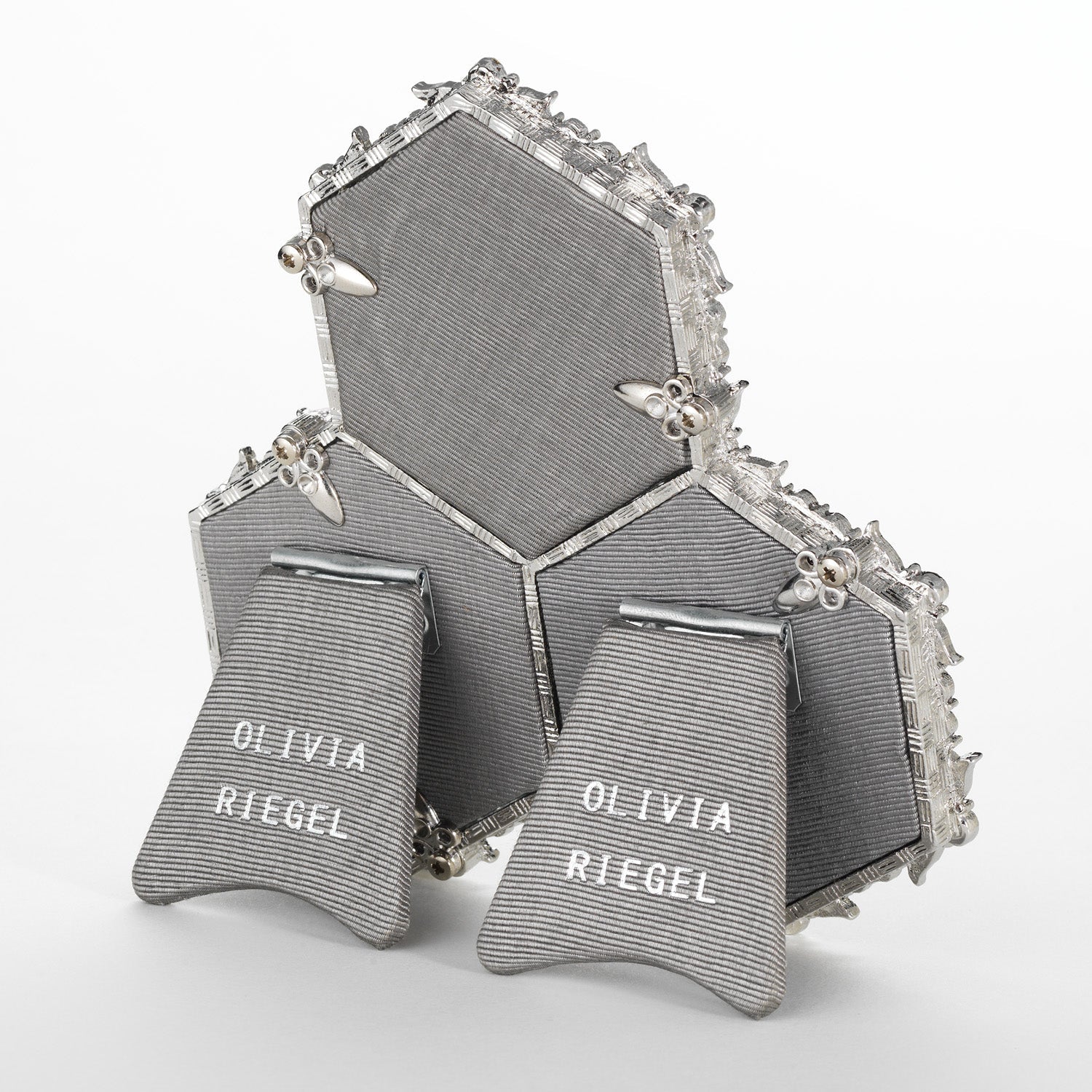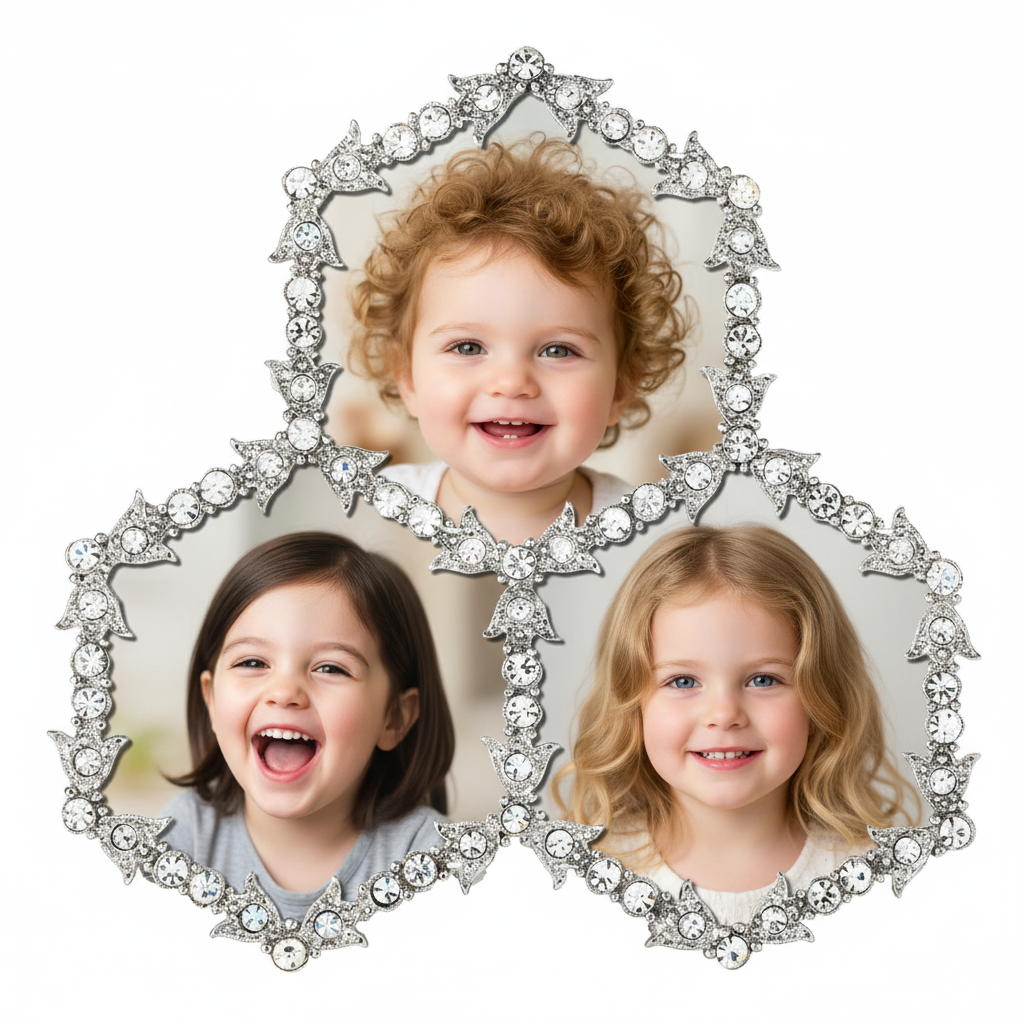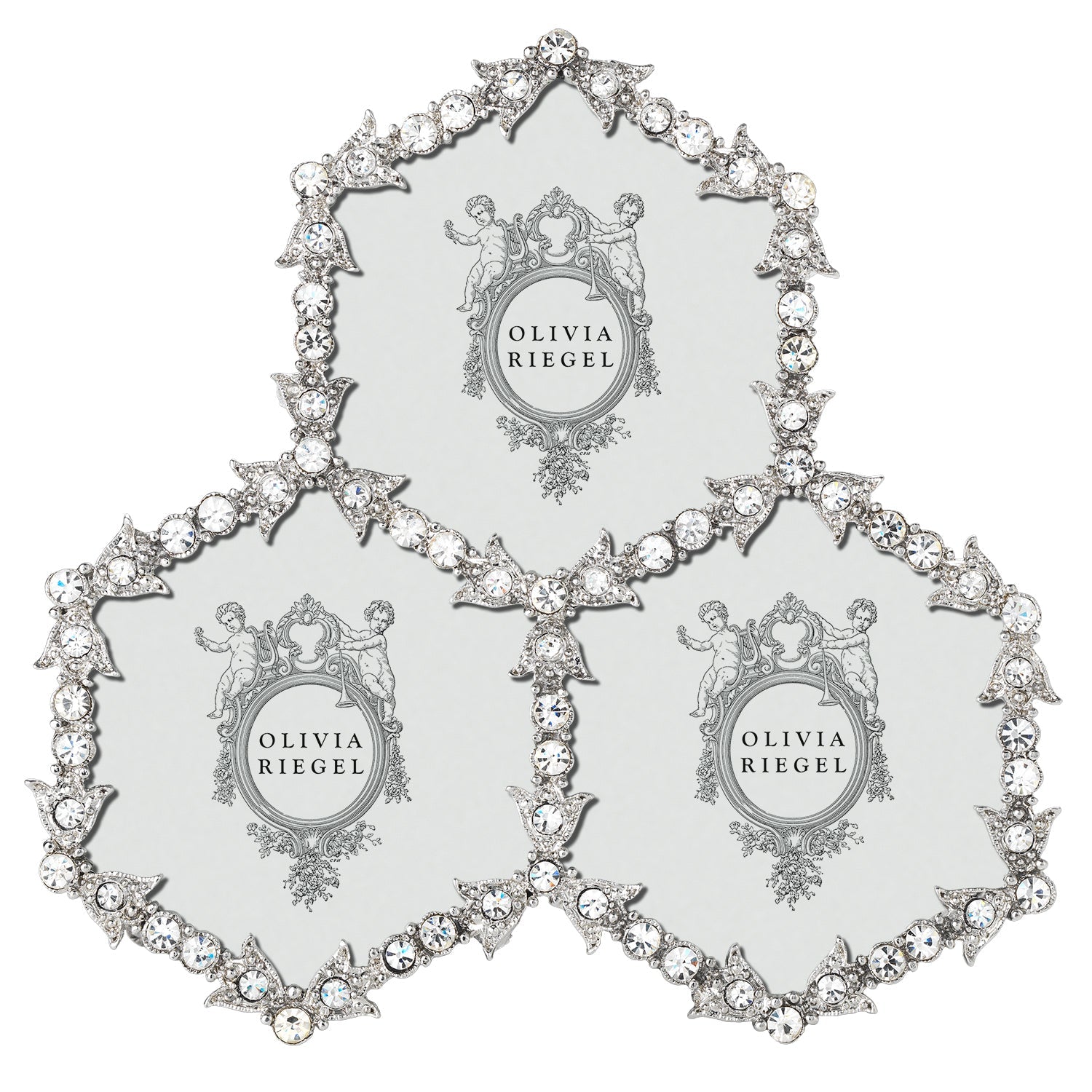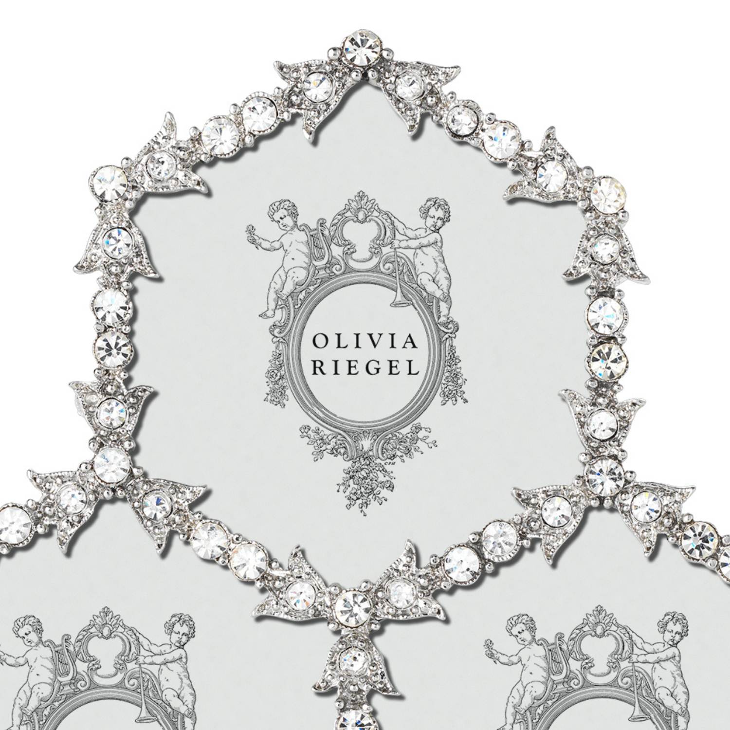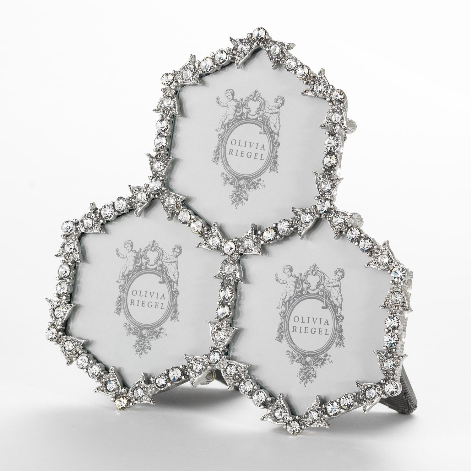 Cast pewter picture frame in silver finish with hand-set clear European crystals and moiré silk back. Tarnish resistant. Signature luxury gift box included.