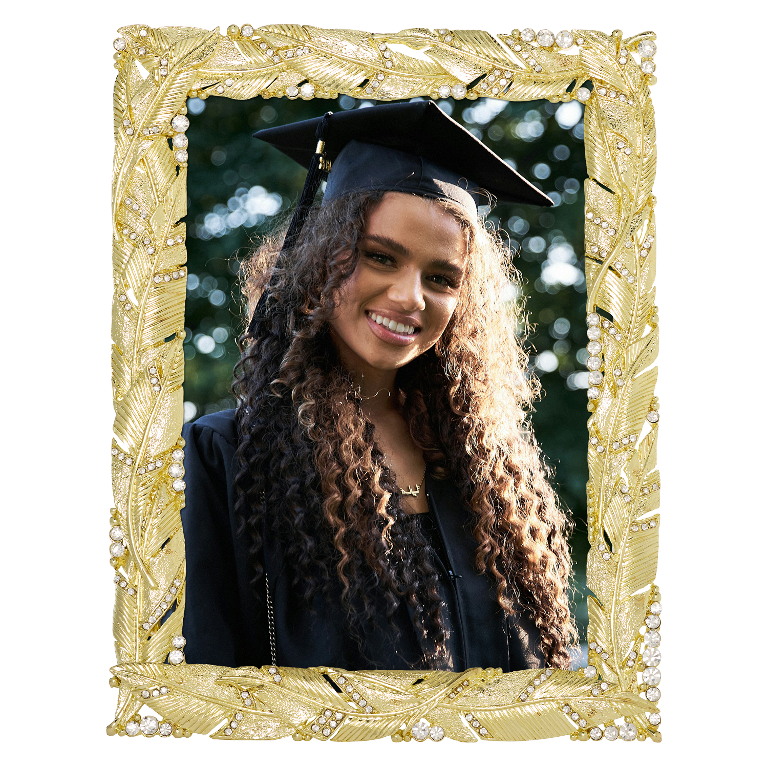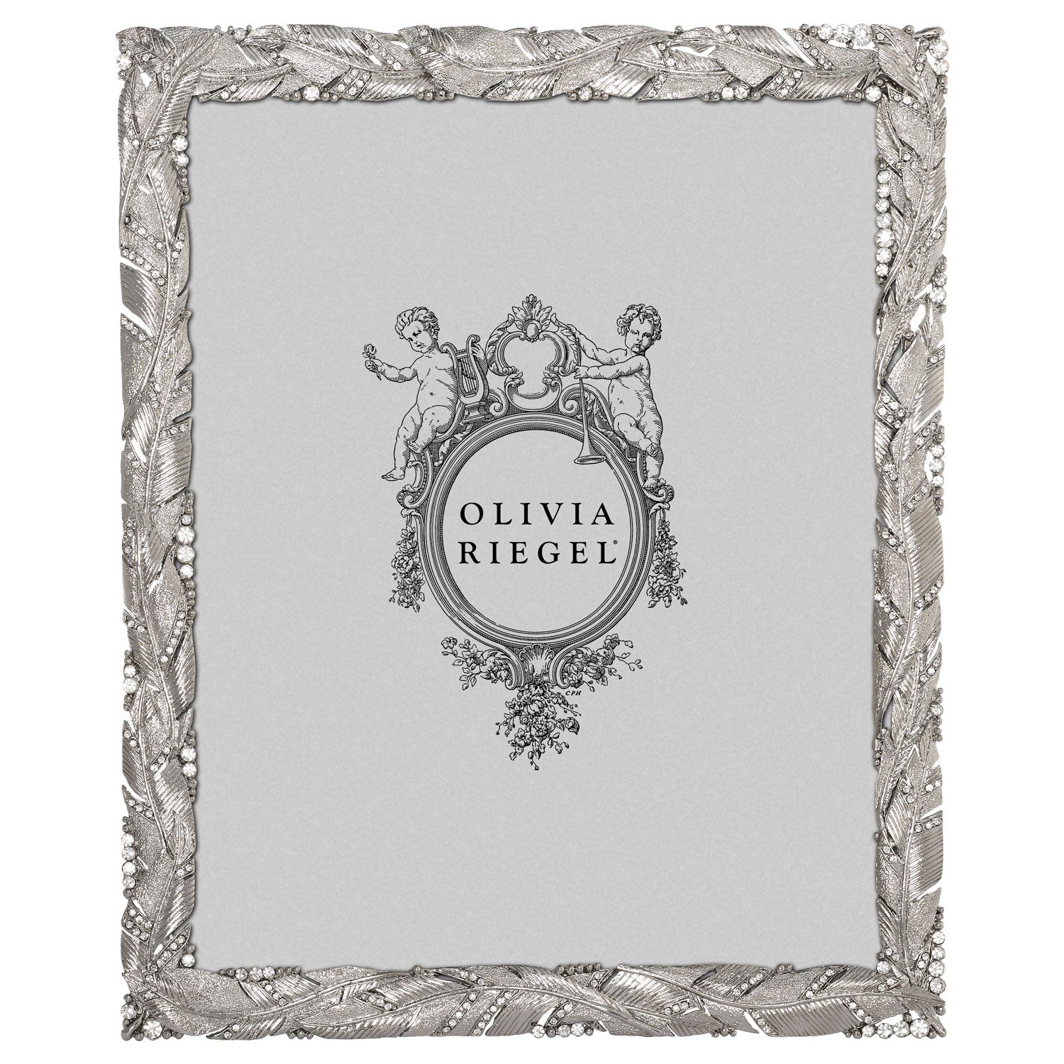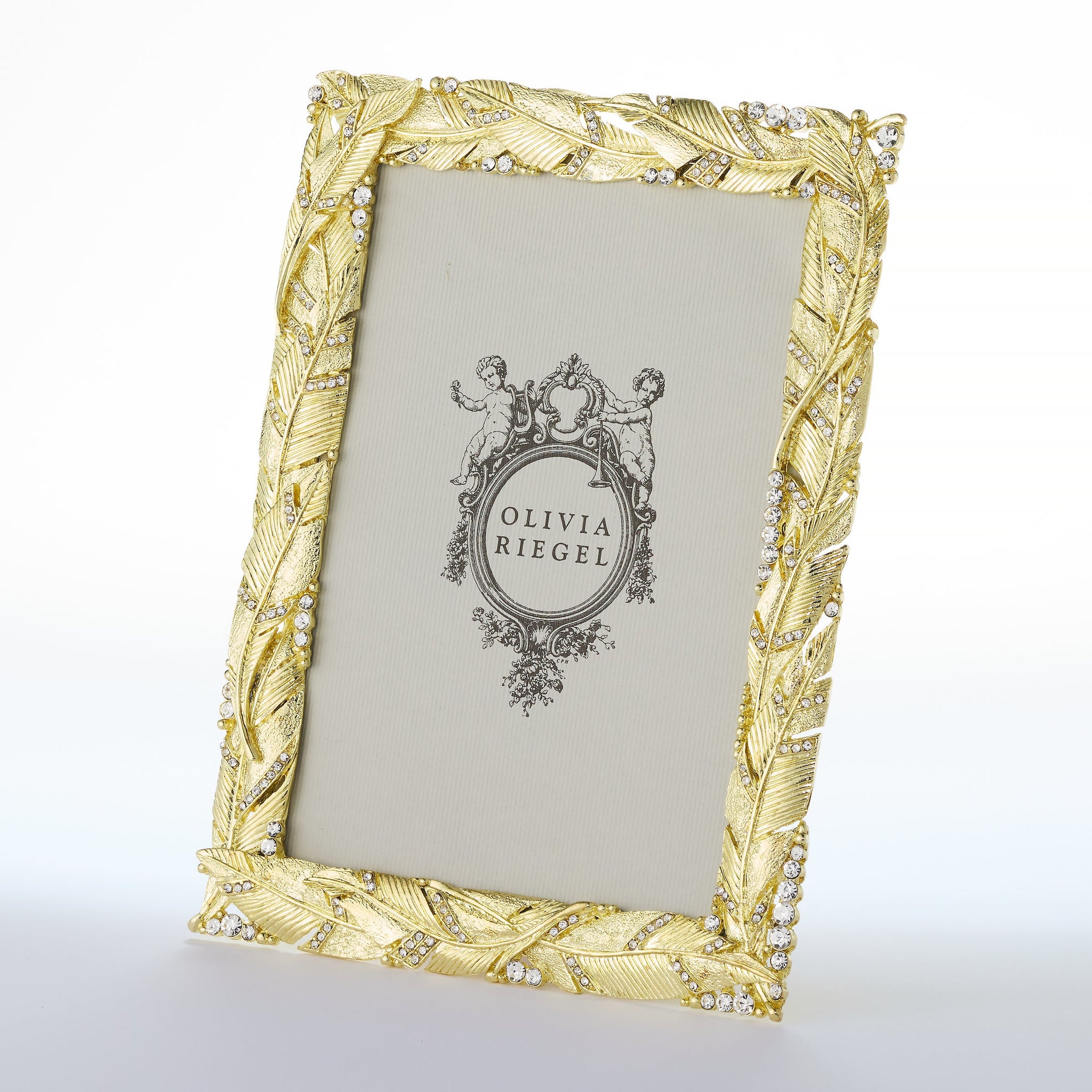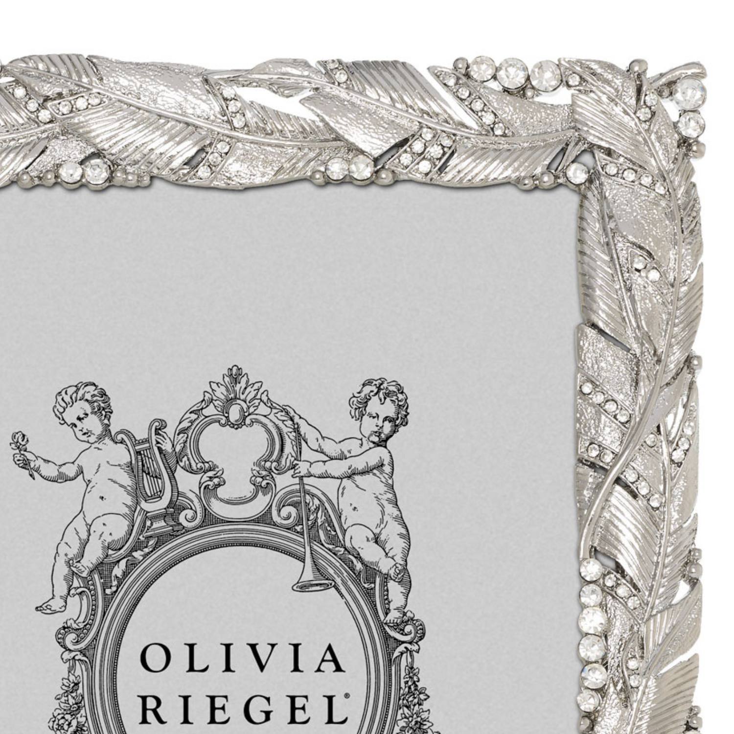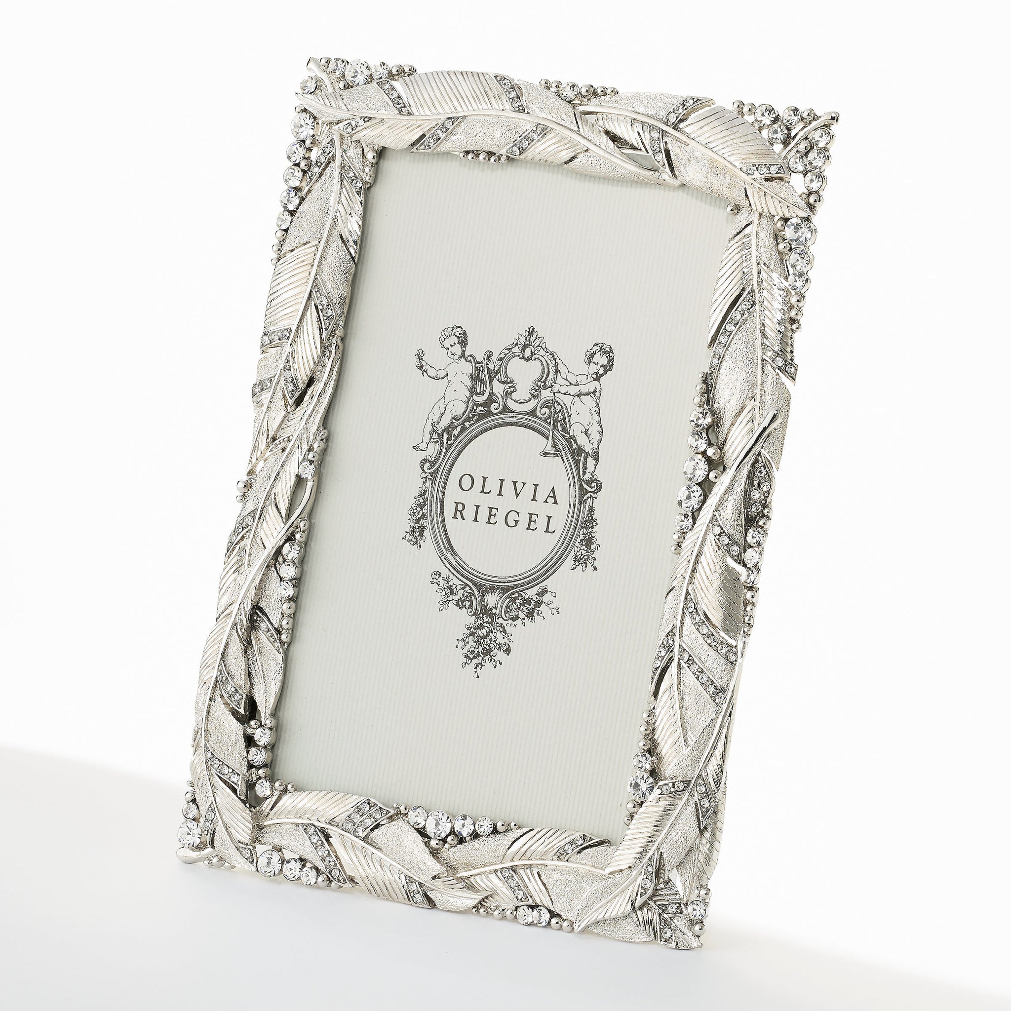 Enhance your space with the grace and beauty of regal plumage. This picture frame is richly cast in gold or silver finished pewter and encrusted with hand-set clear pavé European crystals. Elegant champagne hued moiré silk back, with easel designed for vertical or horizontal placement. Tarnish resistant. Signature luxury gift box included.