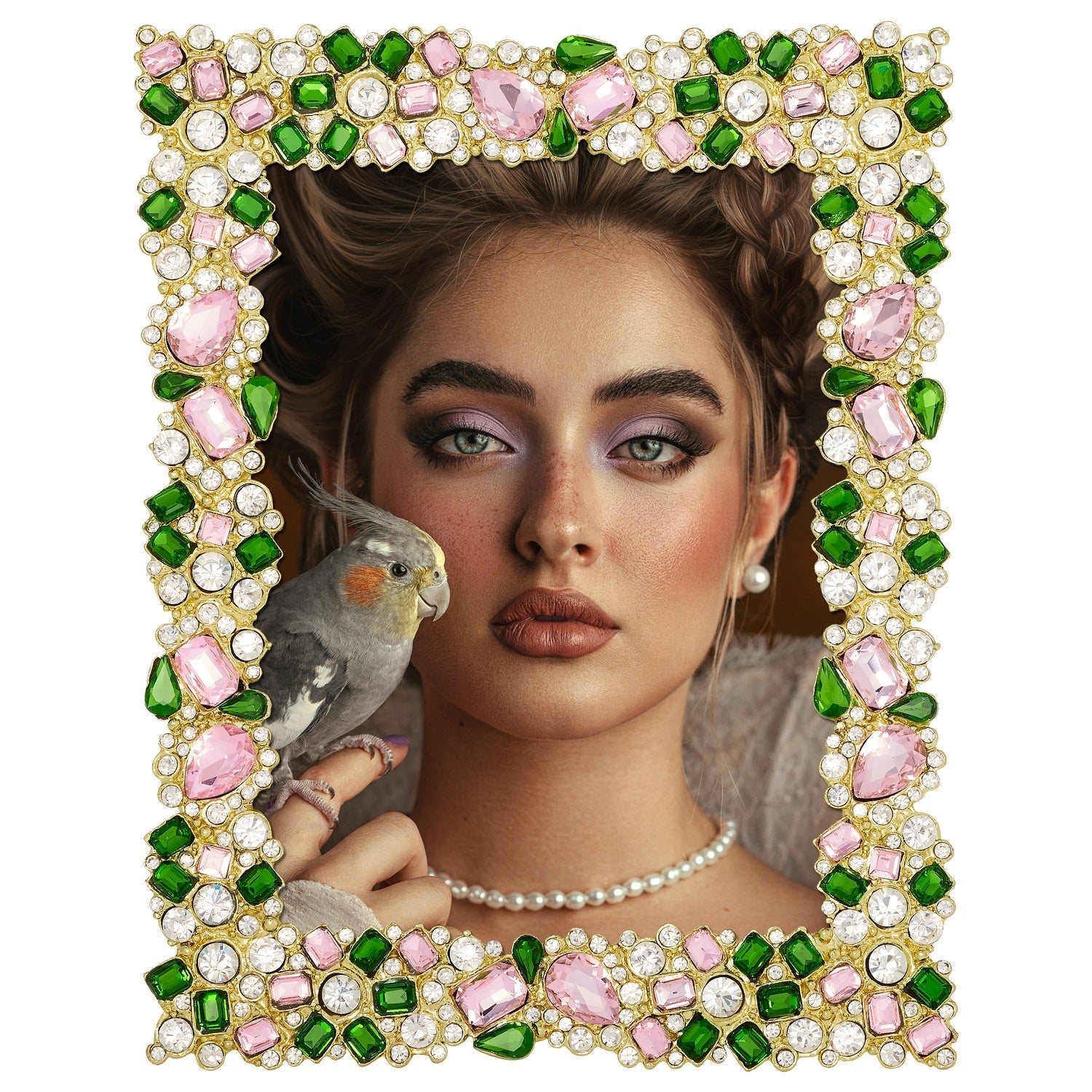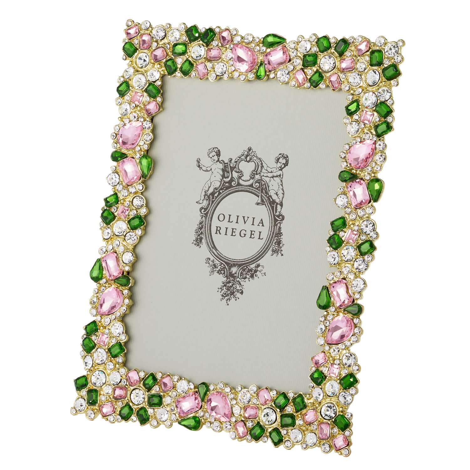 Bold, dramatic, and chic. Gold finished pewter, encrusted with hand-set pink, green, and clear European crystals. Elegant champagne hued moiré silk back, with easel for vertical or horizontal placement. Beveled glass. Tarnish resistant. Signature luxury gift box included.