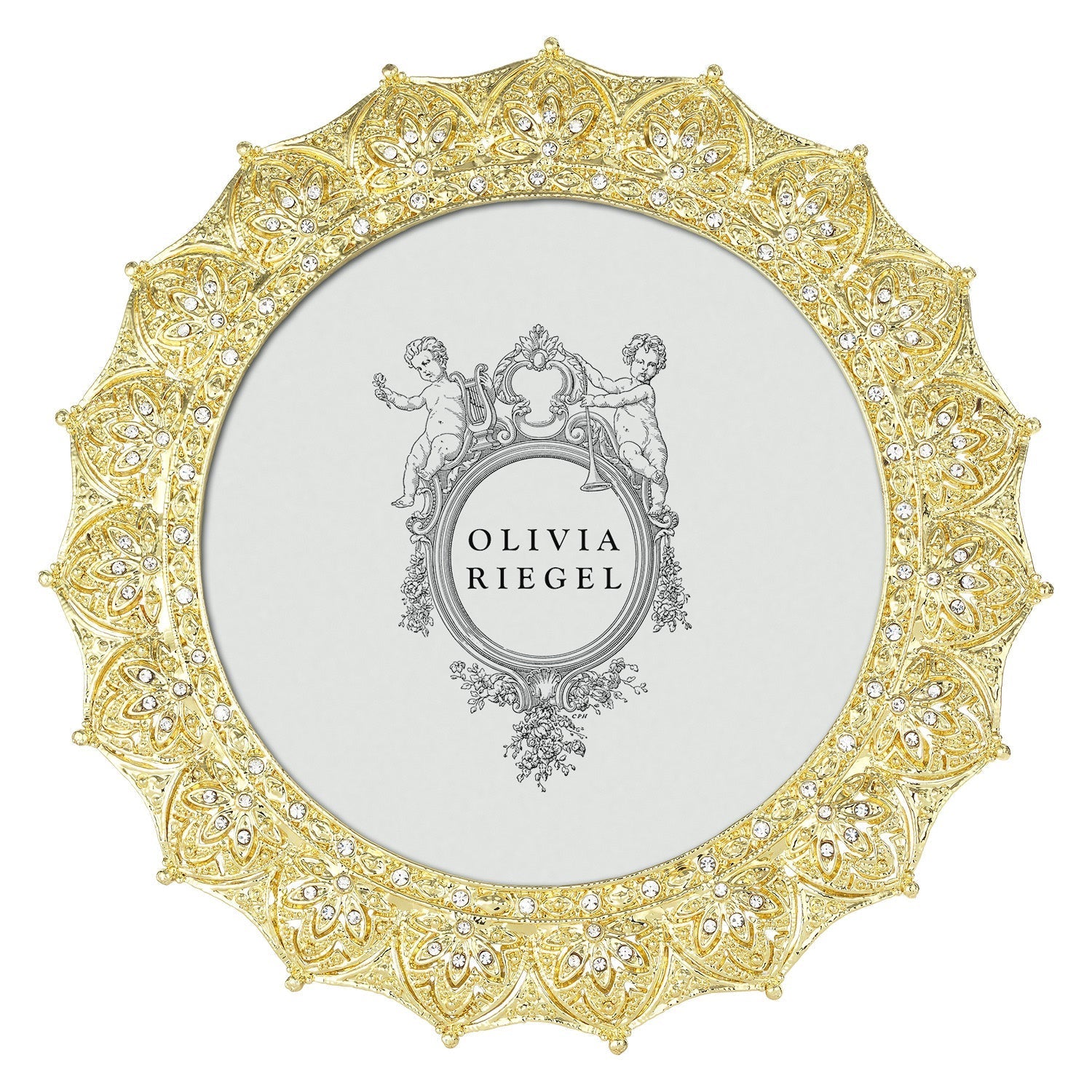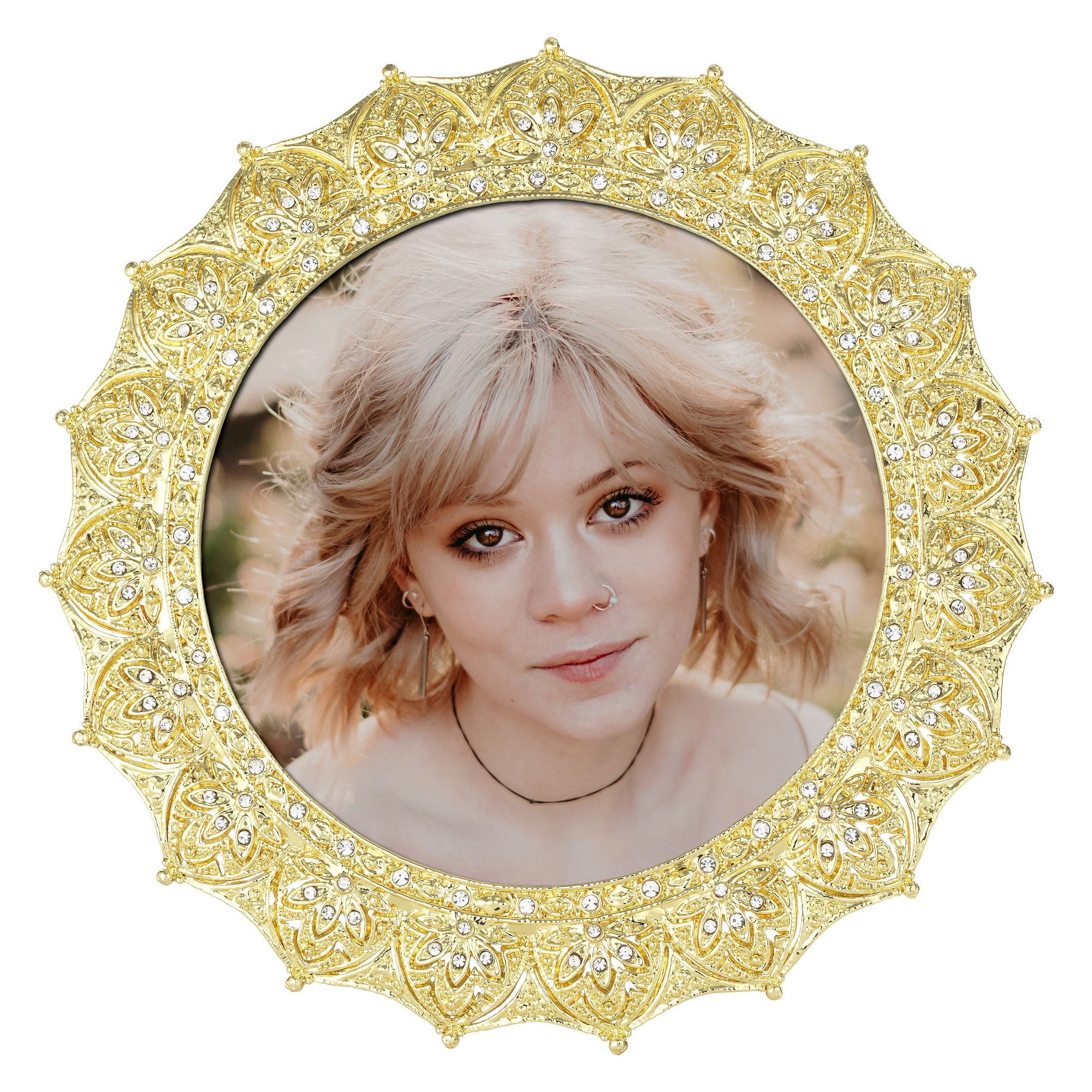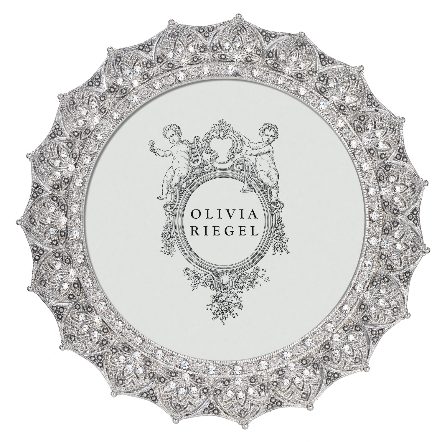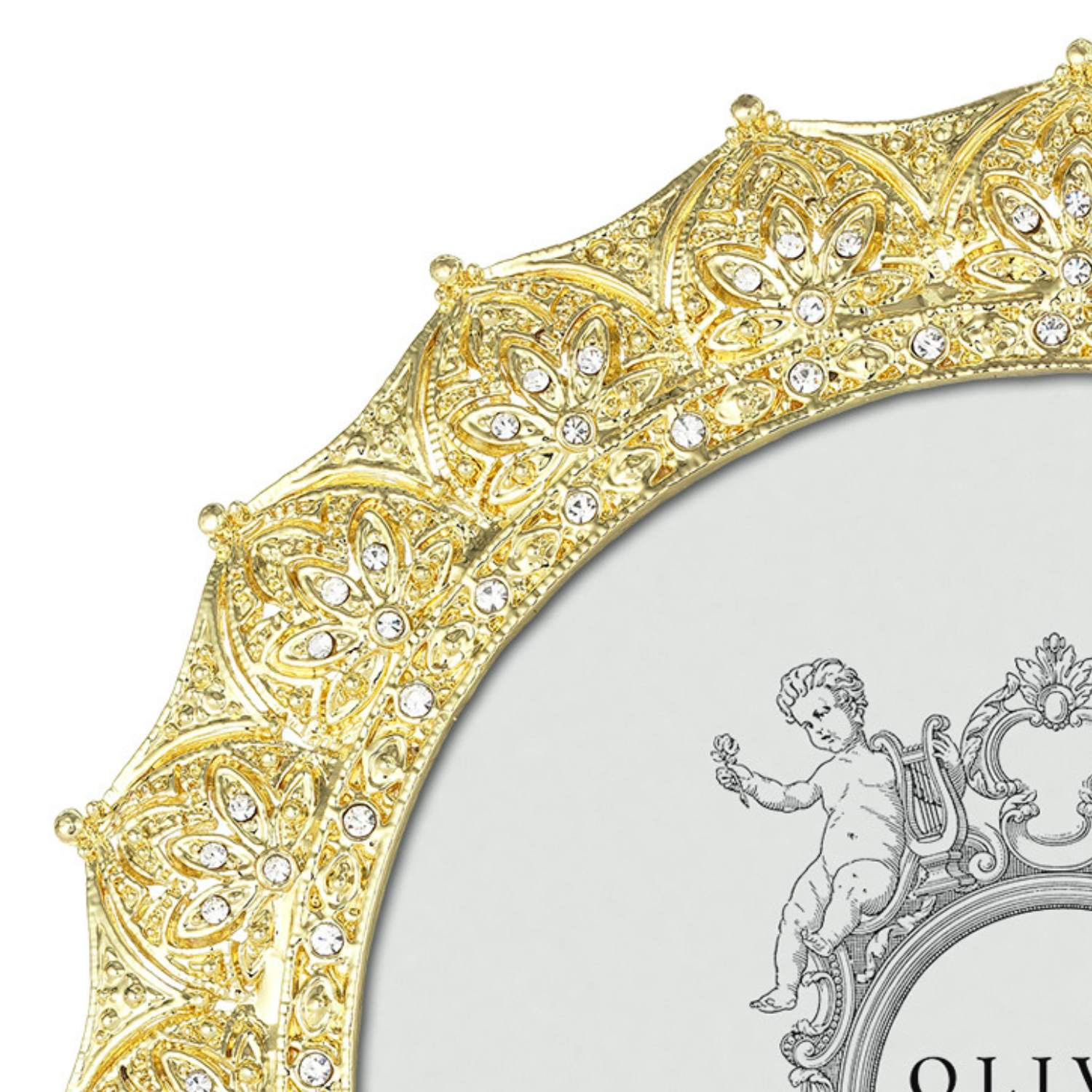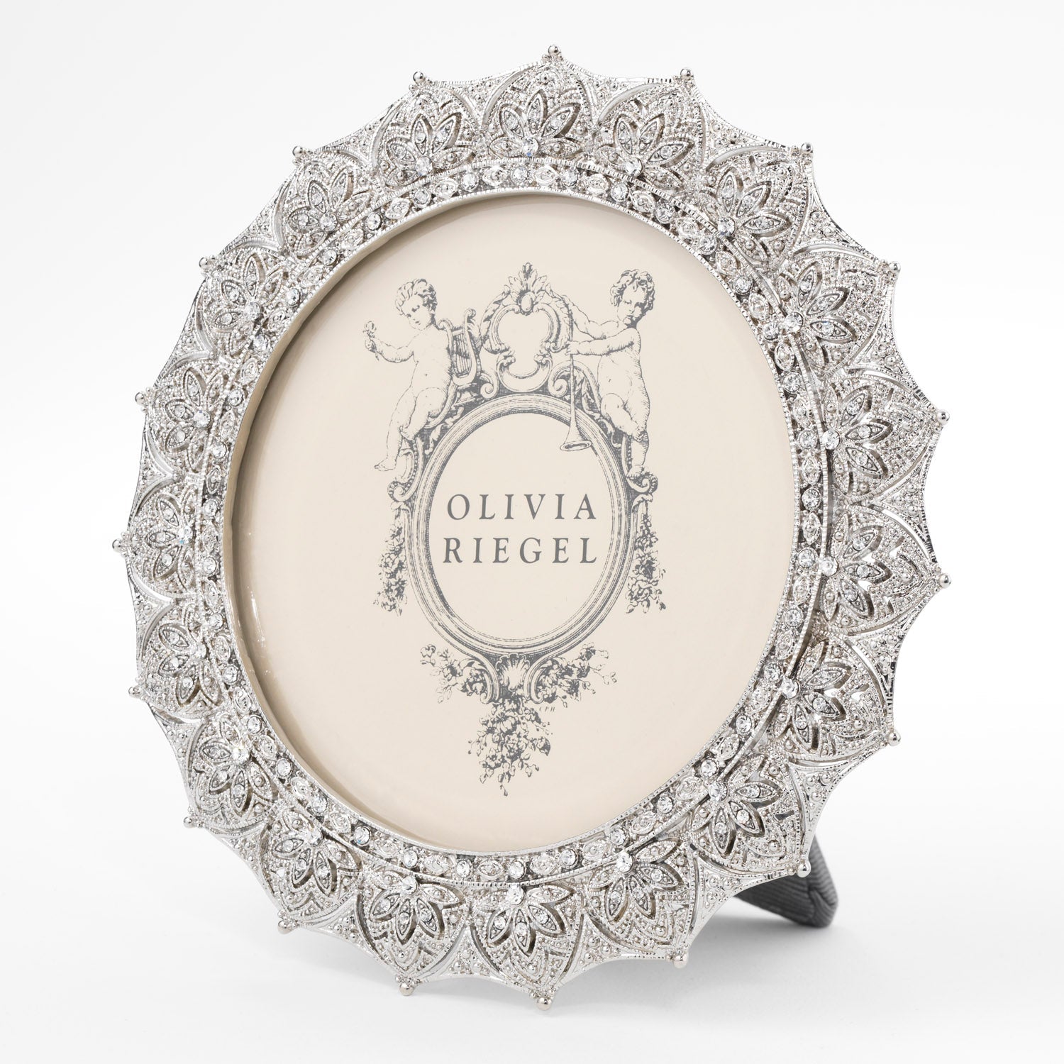 Classic estate jewelry inspired design. Silver or gold finished pewter picture frame, encrusted with hand-set clear European crystals. Elegant moiré silk back. Beveled glass. Tarnish resistant. Signature luxury gift box included.
