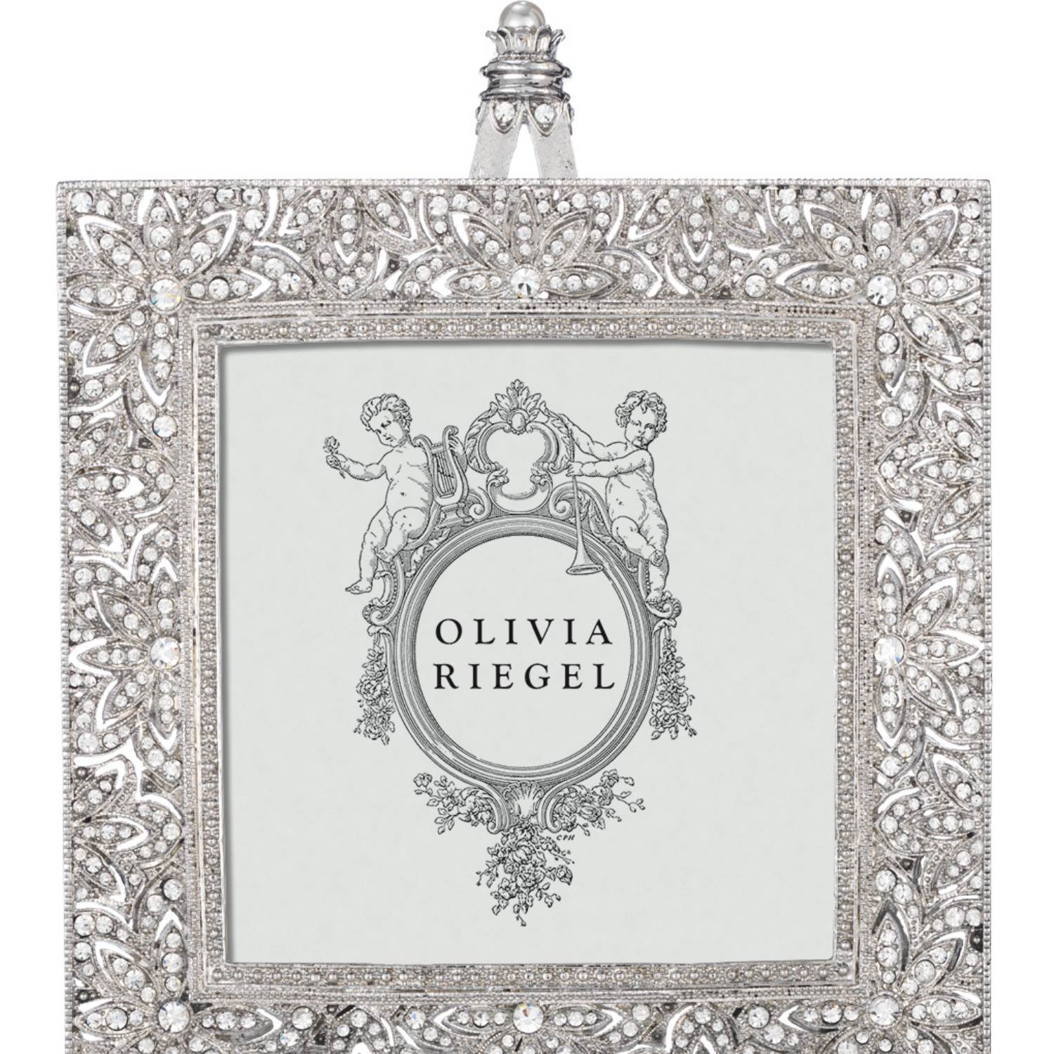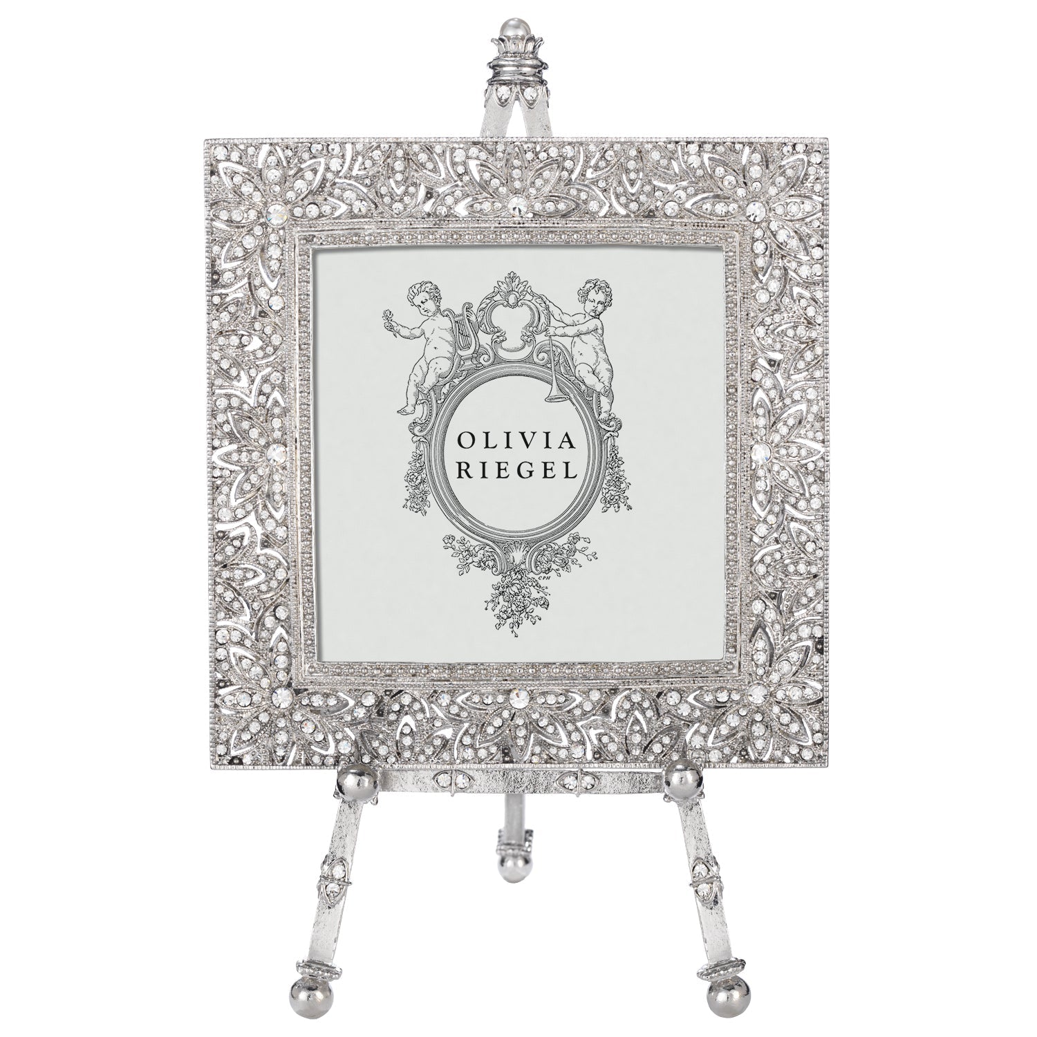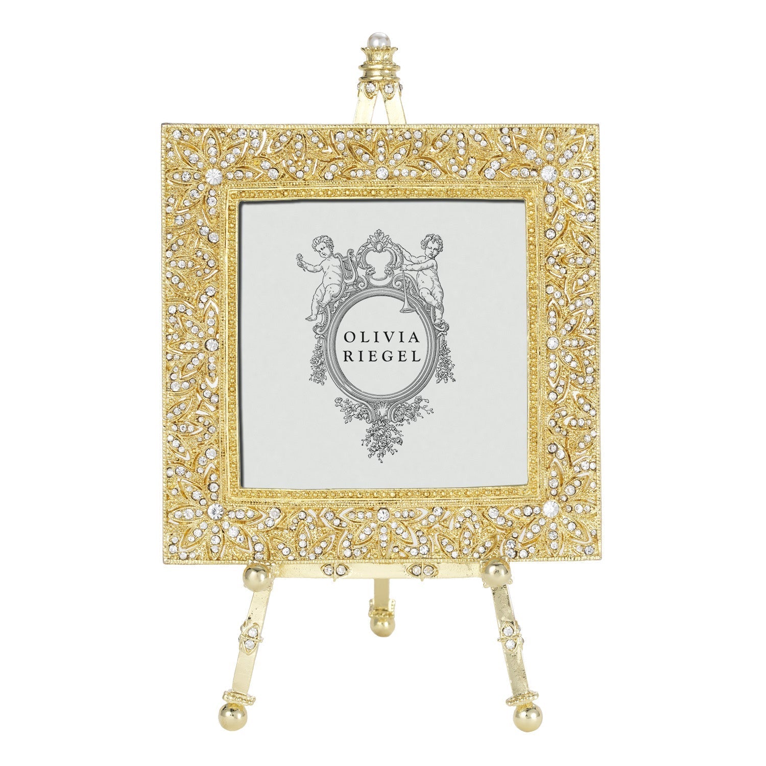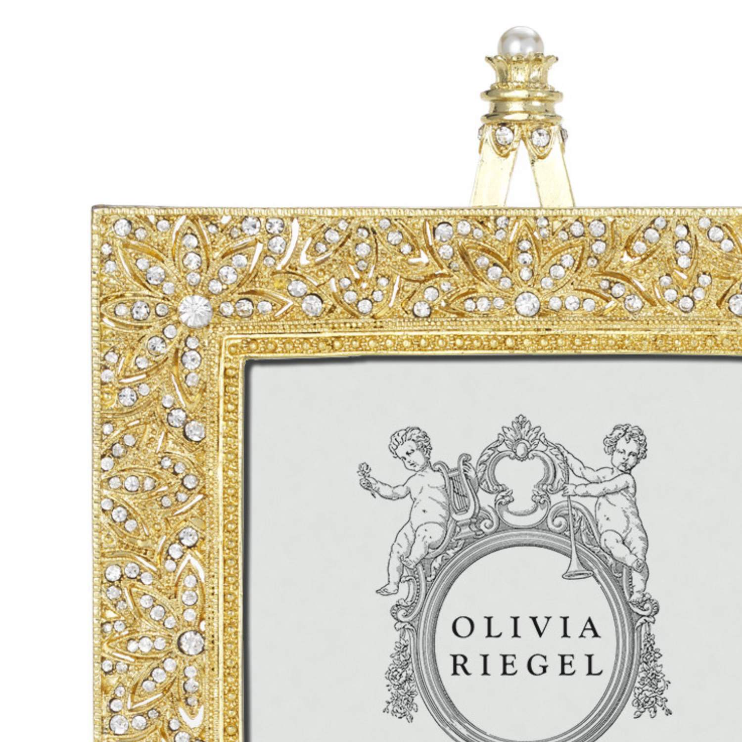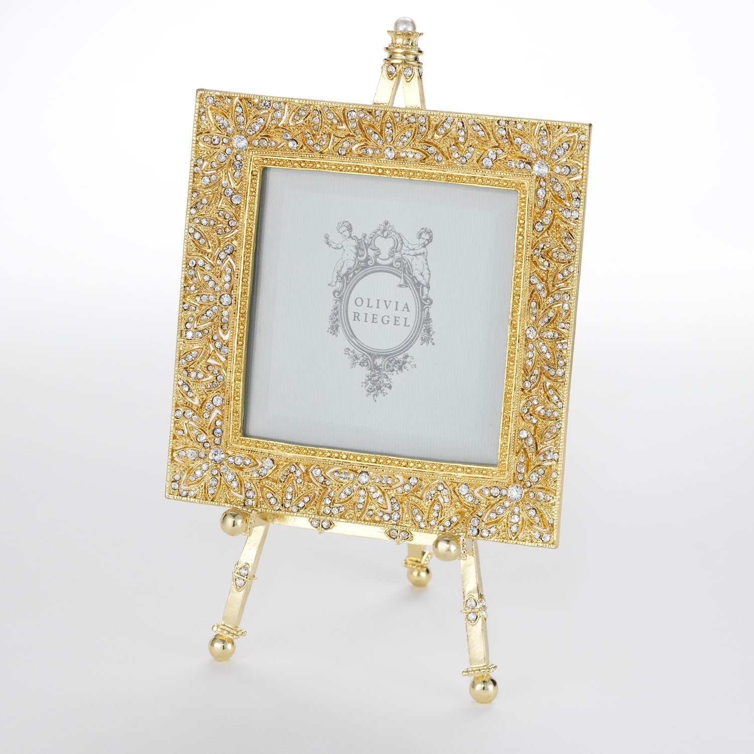 Classic estate jewelry inspired design. Silver or gold finished pewter picture frame, encrusted with hand-set clear European crystals. Decorative easel embellished with clear European crystals and a large faux pearl. Elegant moiré silk back. Beveled glass. Tarnish resistant. Signature luxury gift box included.