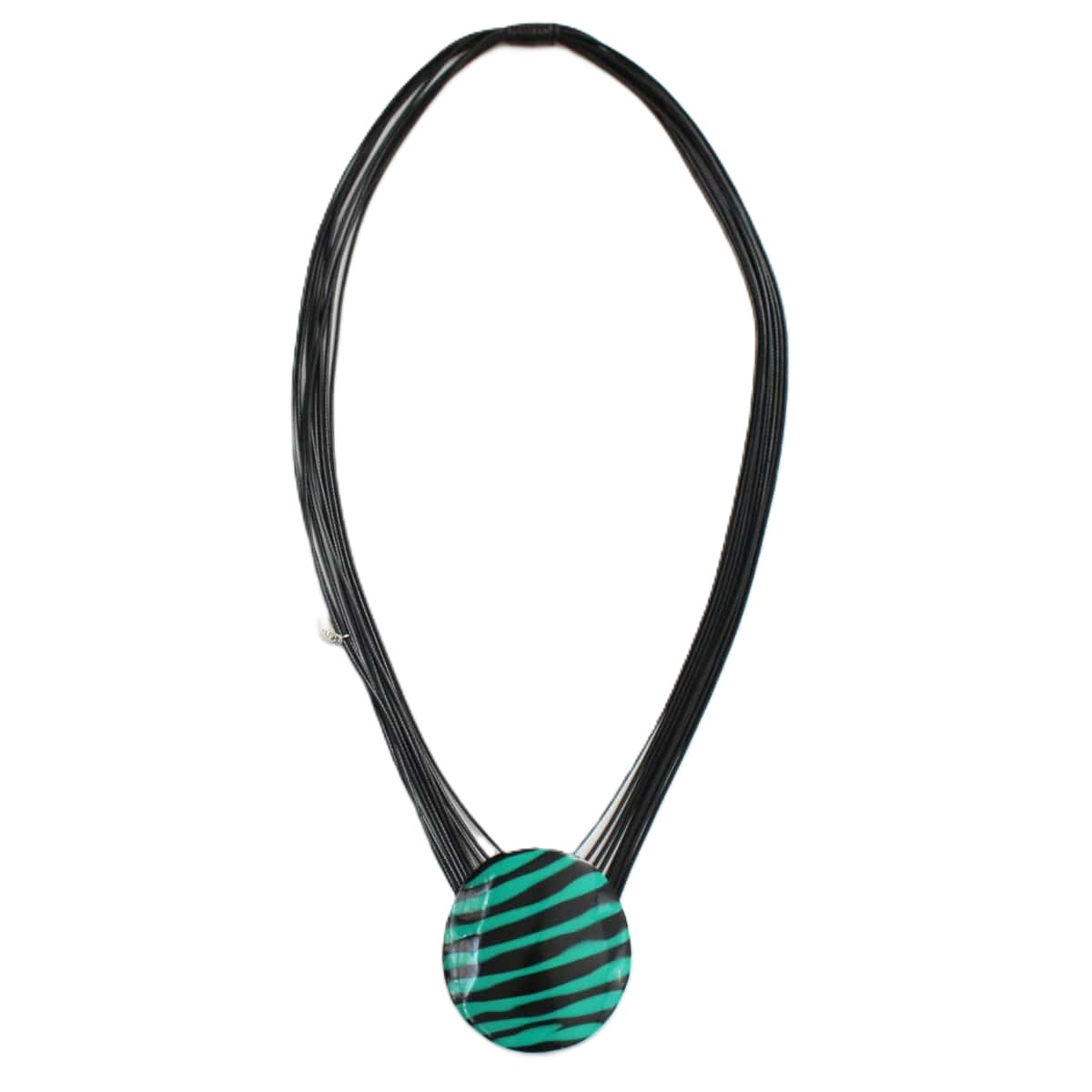 Add a little bit of flare to your outfit with this fun pendant! The thick horn pendant hangs off multiple layers of black cord. Lightweight and easy to wear, the bold green pendant features a zebra like design, sure to stand out on any outfit.