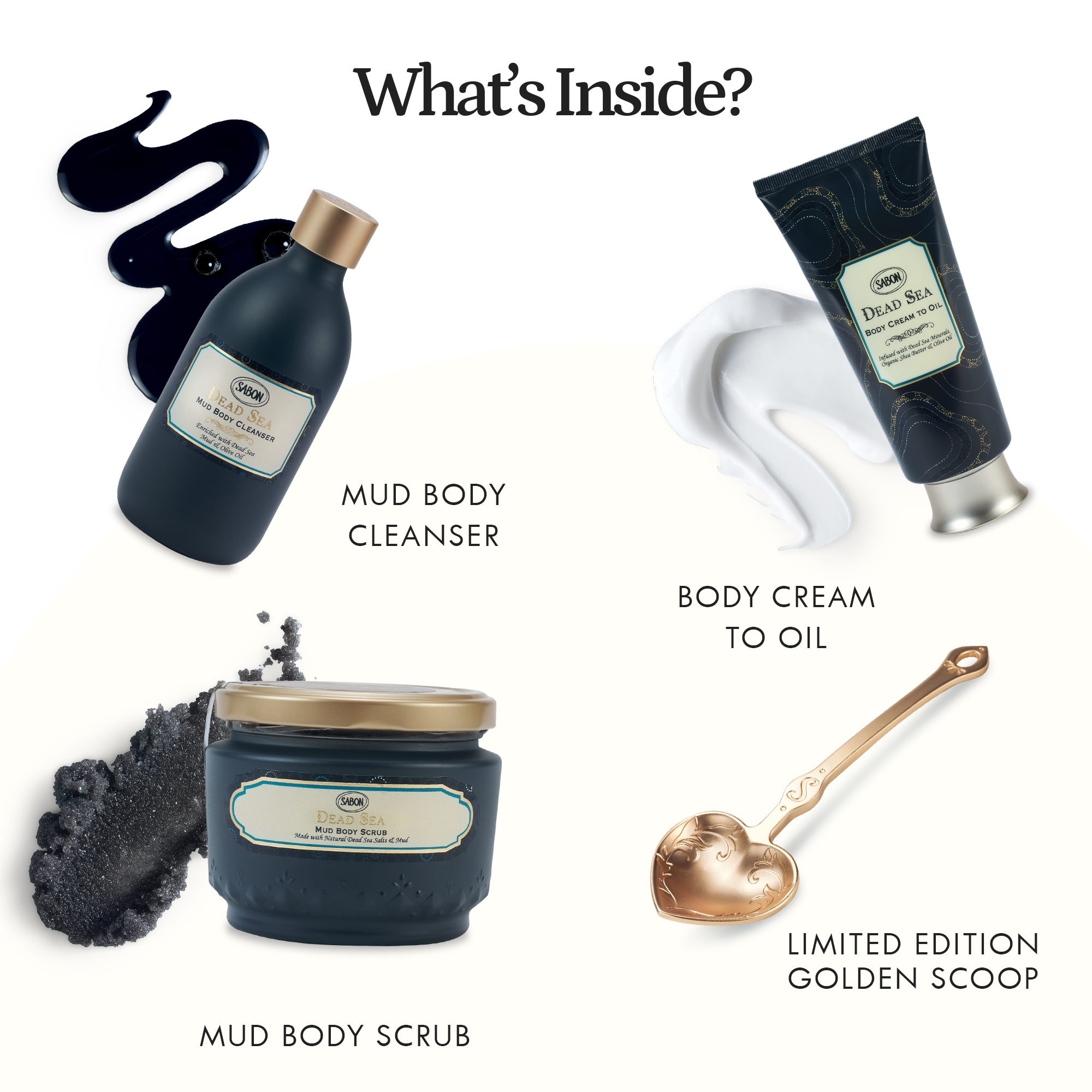 Discover the power of the Dead Sea with our Dead Sea Body Ritual. This kit includes a Mud Body Cleanser 290 mL, Mud Body Scrub 320 gr, and Cream to Oil 200 mL, all enriched with minerals for a luxurious spa experience. Rejuvenate and nourish your skin with this complete body ritual. This Set comes beautifully packaged in a gift box, making it the perfect treat for yourself or a loved one. Includes a Gift Box.