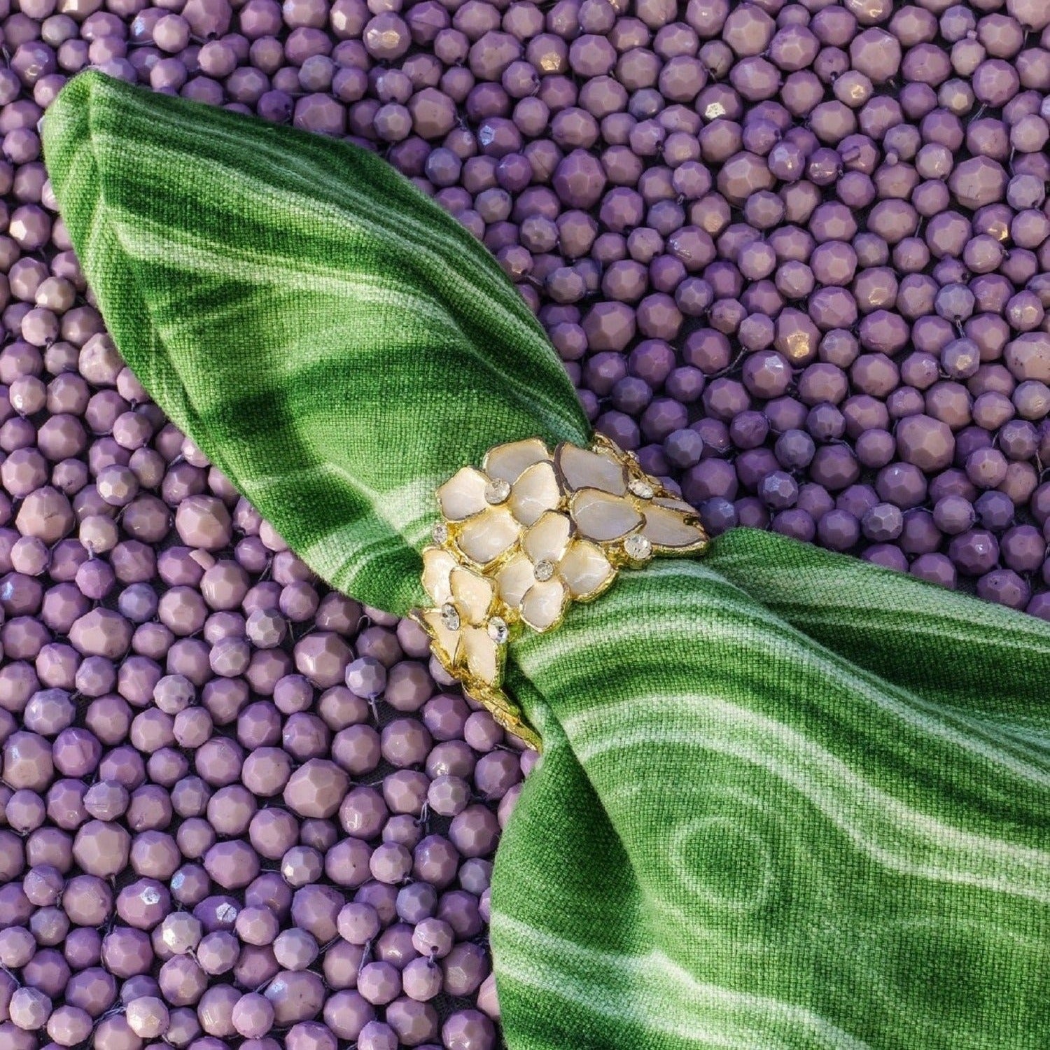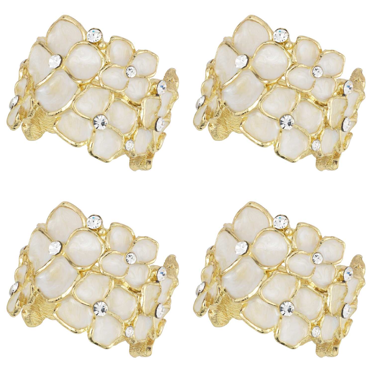 Delicate dogwood blossoms richly cast in gold finished pewter napkin rings with intricate ivory hued hand-enameling and hand-set clear European crystals. Tarnish resistant. Set of 4 napkin rings presented in signature luxury gift box.