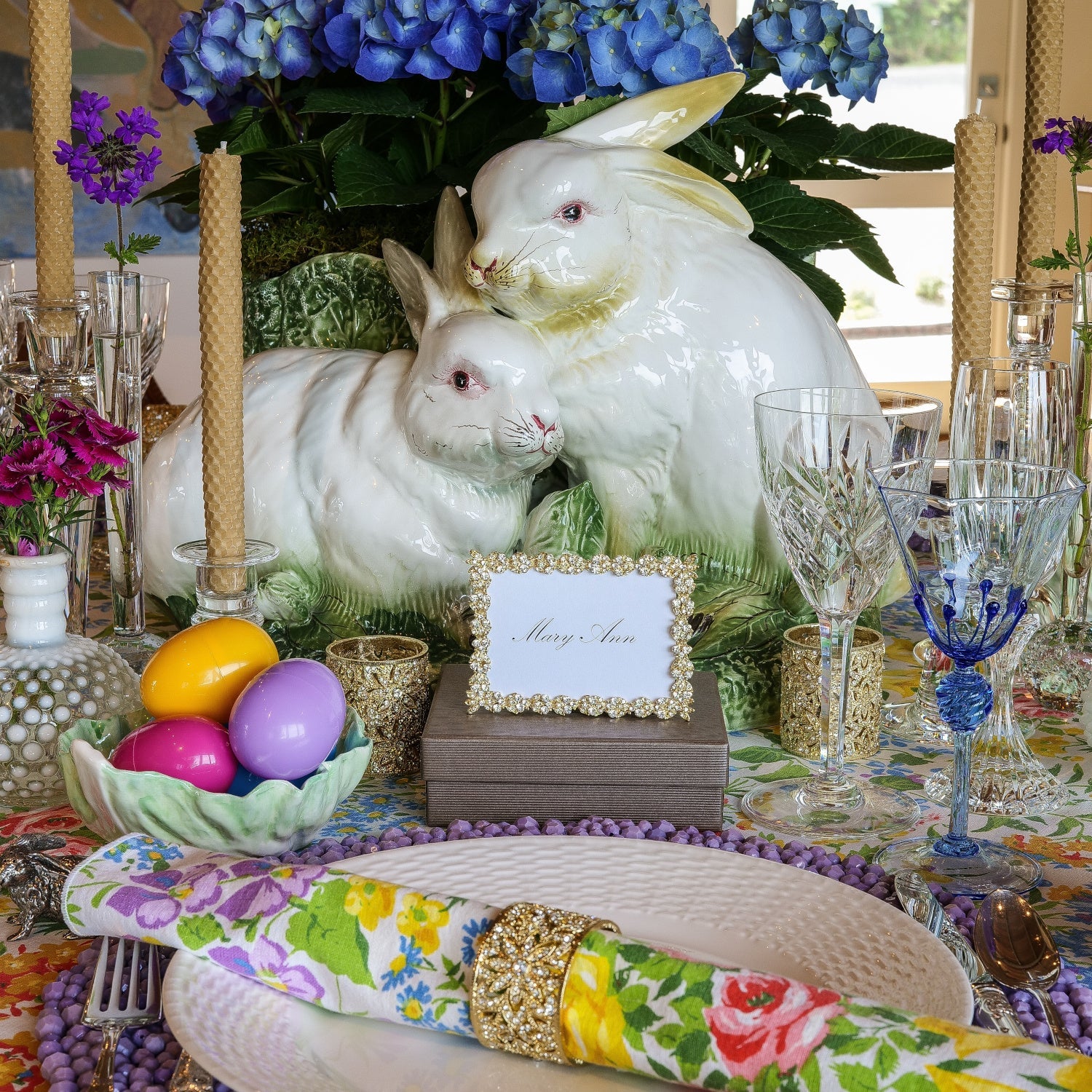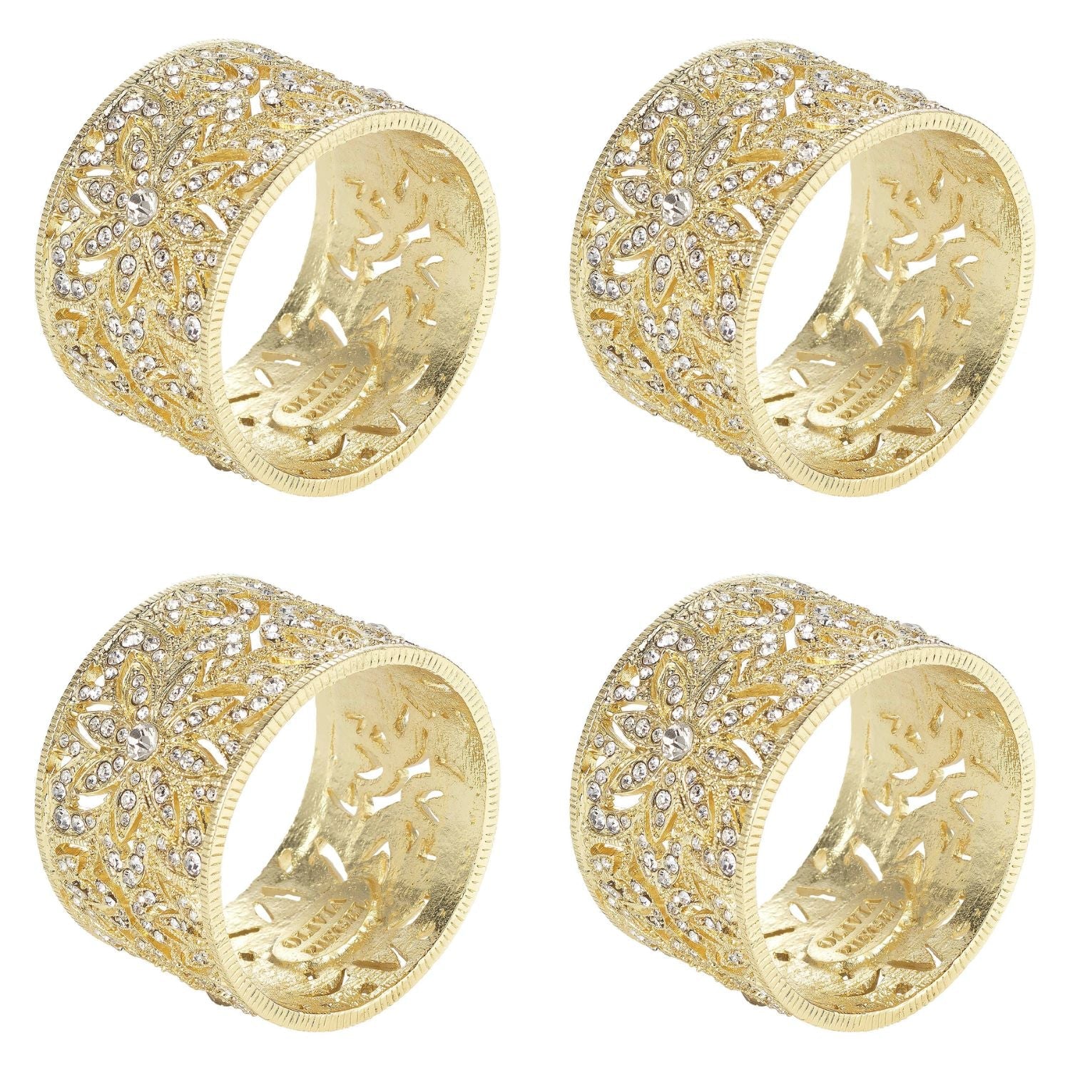 Classic estate jewelry inspired design. Gold finished pewter napkin rings, encrusted with hand-set clear European crystals. Tarnish resistant. Set of 4 napkin rings presented in signature luxury gift box.