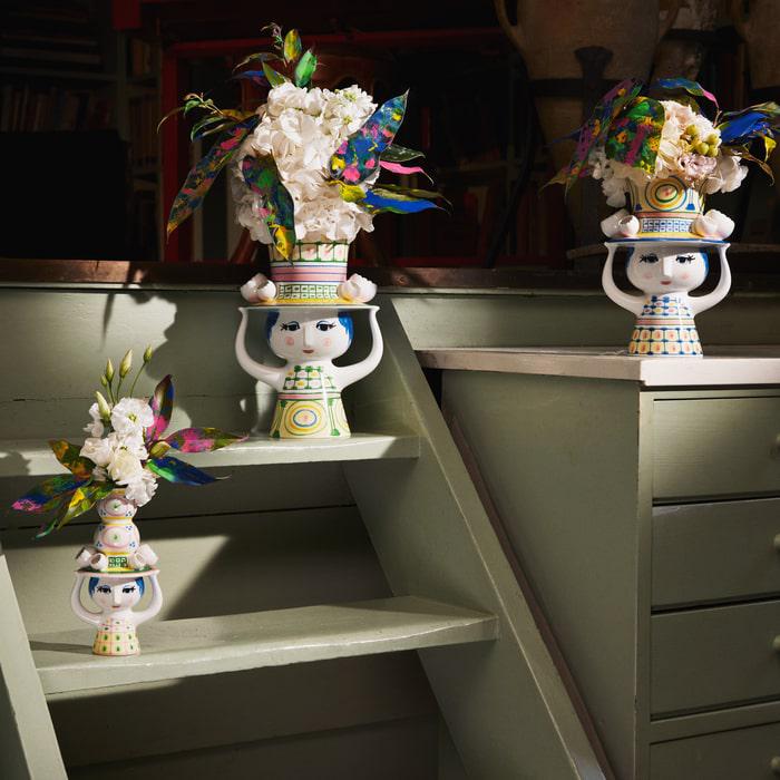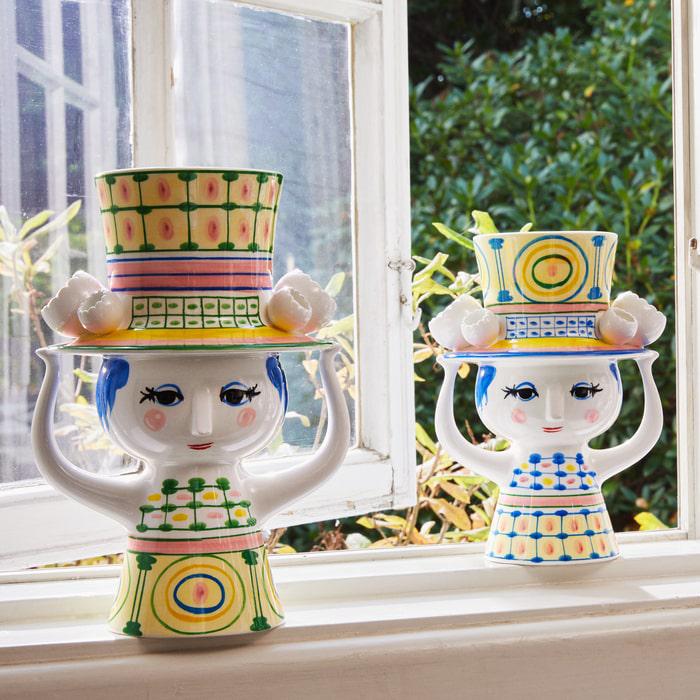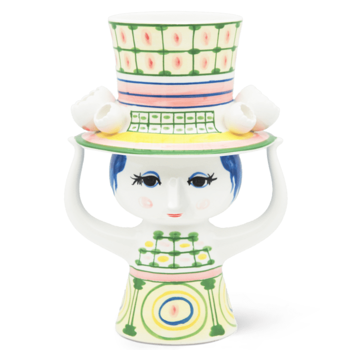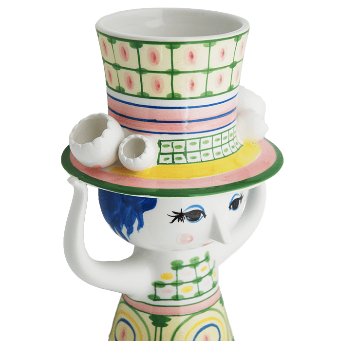 This lovely Lady with Hat vase measures 9.6" and is made from glossy, glazed ceramic. Hand-painted in wonderfully vibrant colors, the lady's hat is perfect for a blossoming bouquet of seasonal flowers. Much like Wiinblad himself, the Lady with Hat embodies all things creative, quirky, and imaginatively expressive.