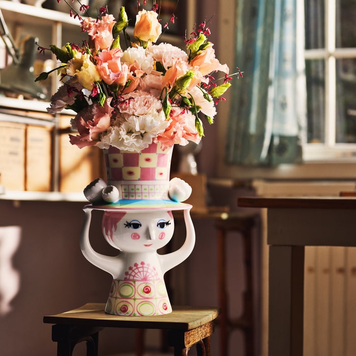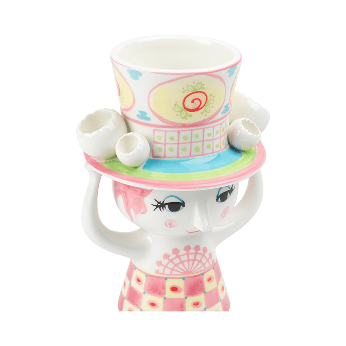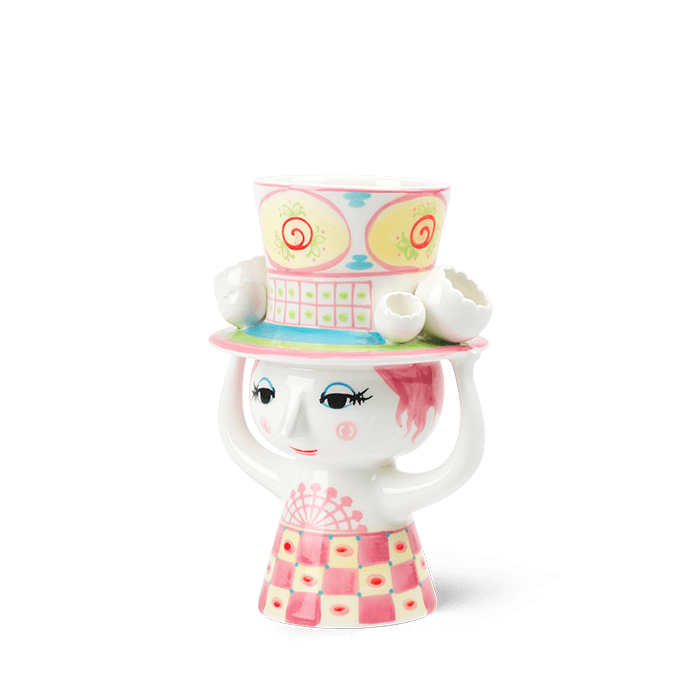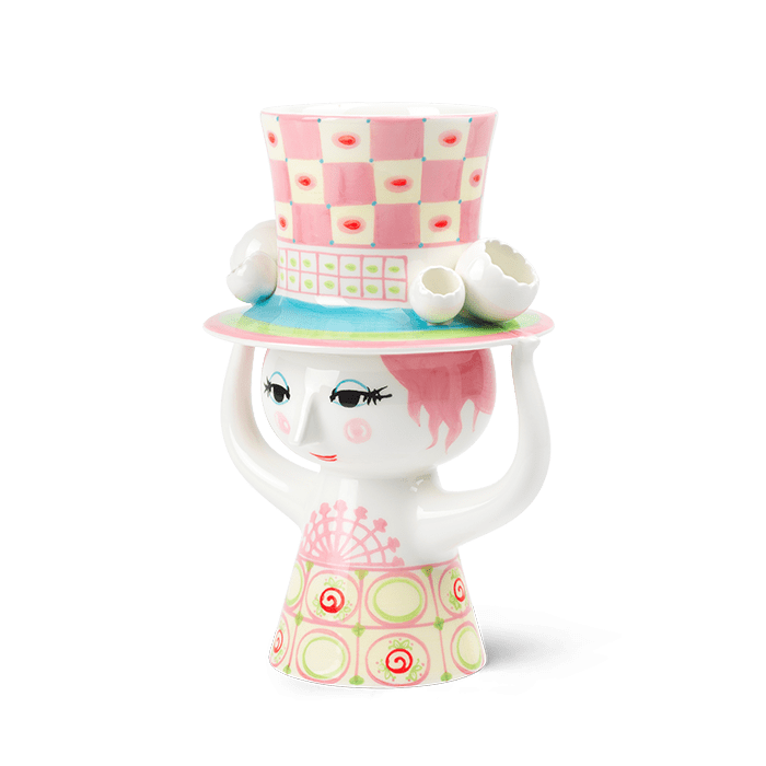 Invite a true Lady into your home and let her fill it with cheerful vibes through her vibrant colors, quirky details, and hand-painted decorations. The vase is hand-decorated from top to bottom with intricate motifs inspired by Wiinblad’s rich archive. The base features the iconic face with almond-shaped eyes, a triangular nose, rosy cheeks, and a playful smile. With her sculptural arms, the hand-painted Lady holds her grand hat, adorned with charming ceramic tulips on each side.