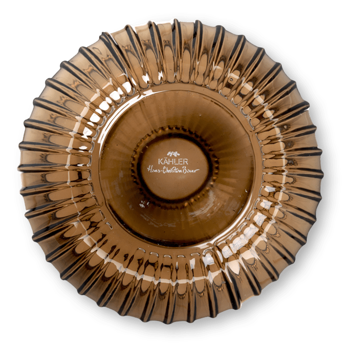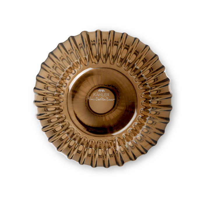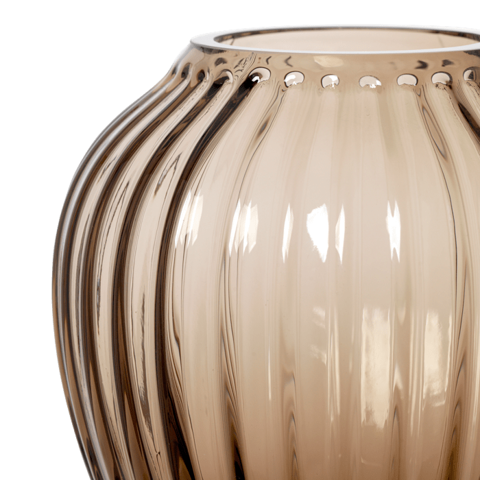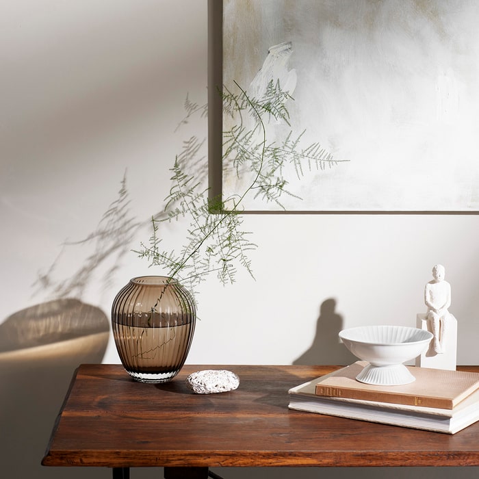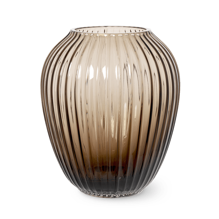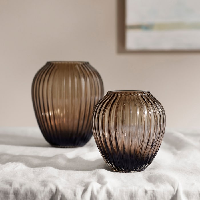 The iconic rippling grooves of the Hammershøi Collection are present across the range, including this lovely, walnut-colored glass vase. The Kähler Hammershøi glass vase has a beautiful silhouette, yet a heaviness and stability.