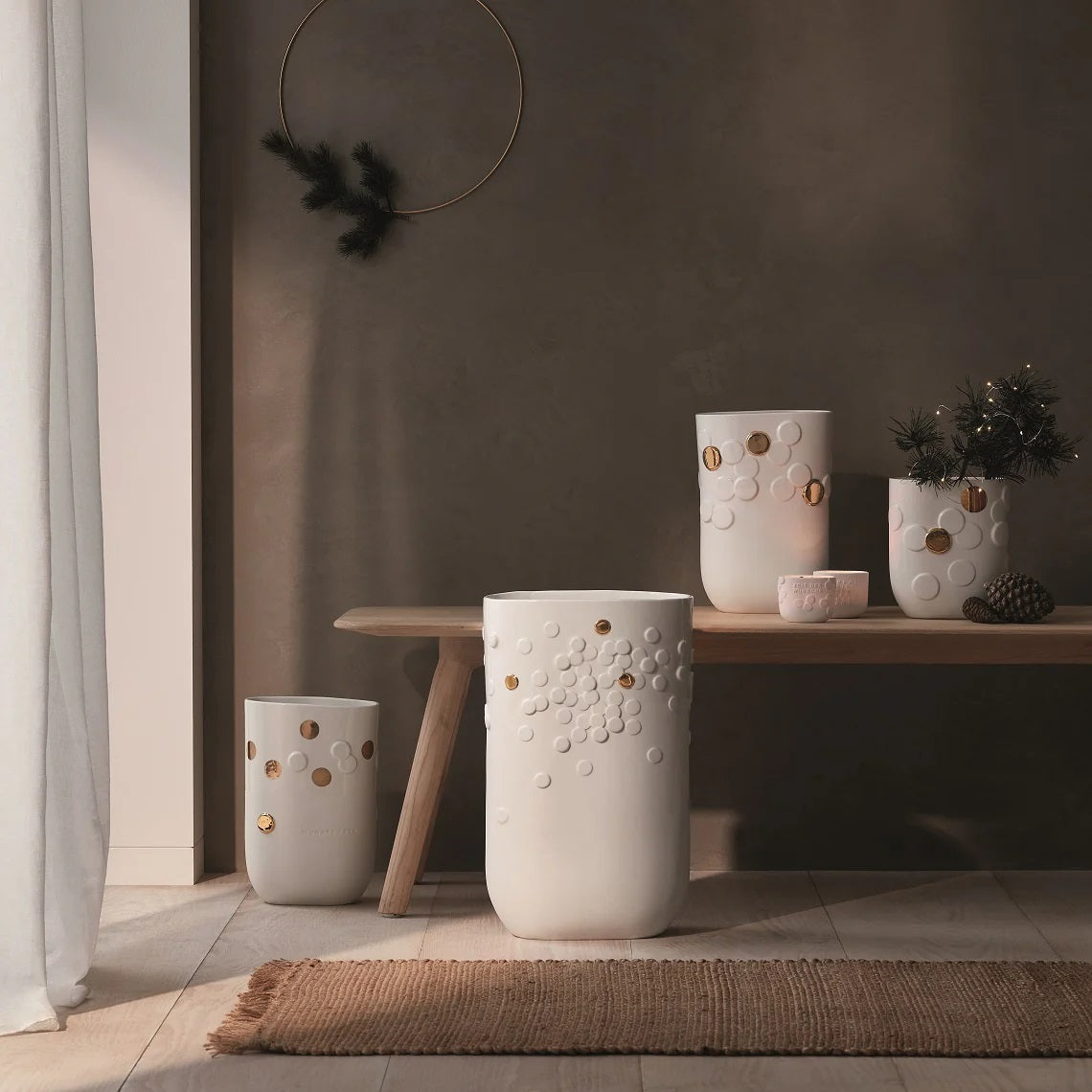 Porcelain Gold Dots Oval Vase is whimsical, beautiful and utterly dreamy. Artistic perspective draws thoughts of bubbles floating through the air, or a bit of magical pixie dust moving toward an unsuspecting dreamer. Oval in shape, the vase is unique and can be used for flowers or as a stand-along work of art. Vase is glazed inside to contain water and is partially glazed outside with perfectly placed random gold detail.