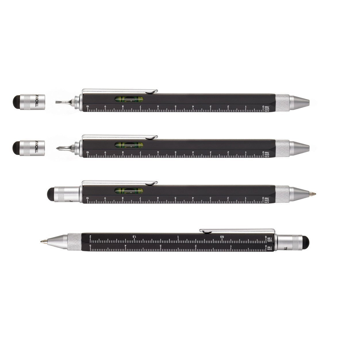 This nicely weighted ballpoint pen has six sides, which ensures a very comfortable grip when writing. The Troika construction Ballpoint features an architectural ruler in both centimeter and inches, a level, mini screwdriver with both flat-head and Phillips head, and a matching color stylus. Surgical grip ensures easy twist action. Spare parts and refills available. Troika's Construction Pen in classic black finish