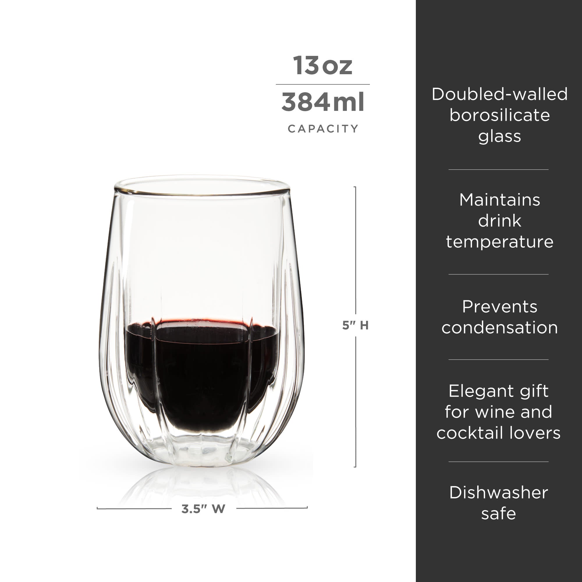 Take time to savor your wine. The double-walled design of these stemless glasses maintains your wine’s temperature and prevents condensation for a smooth sipping experience. Made from borosilicate glass with a cut-glass design.