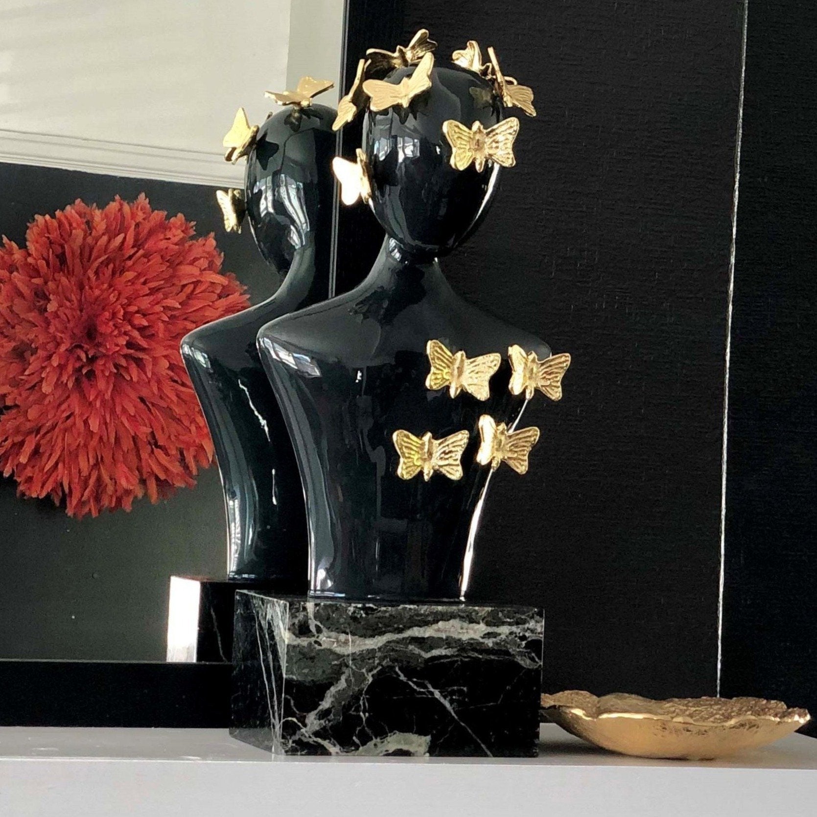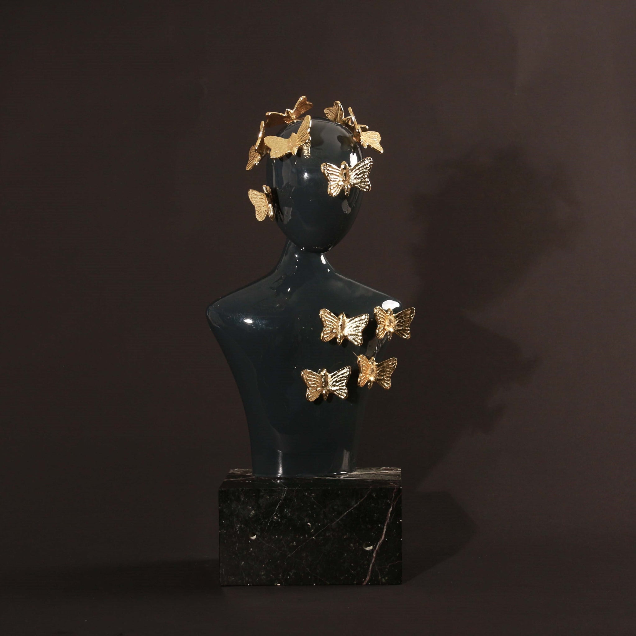 Around the world, butterflies represent freedom, vulnerability, metamorphosis, joy and the inevitability of constant change - a powerful metaphor for the stages of our own life.  Delicately balanced gold-plated butterflies glow on a Graphite hand enameled bust, starting from the heart and and continuing on to the head. A stunning sculpture on a mantel or a pedestal.