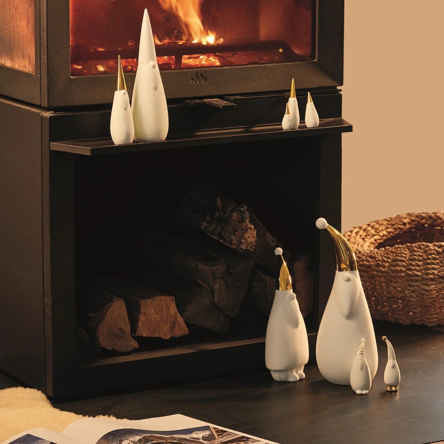 Porcelain Santa Gnomes With Design Hats - 3 Piece Set are beautifully quirky with their hats tipping to the holiday fun. Beautiful Christmas statuettes, which resemble popular gnomes, are perfect at the dinner table or on a shelf. Beautifully gold designed hats add interest and fun to this charming set. Endearingly small size. Delight young and old with these holiday friends.