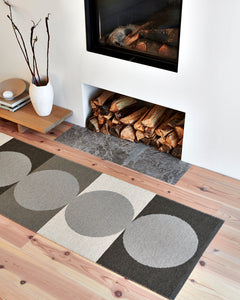 The Pappelina Rugs are woven on a traditional loom using wooden shuttles. For indoor or outdoor use, the rugs are machine-washable and made from Swedish-manufactured certified PVC. Each rug features reinforced, welded edges for strength and durability.