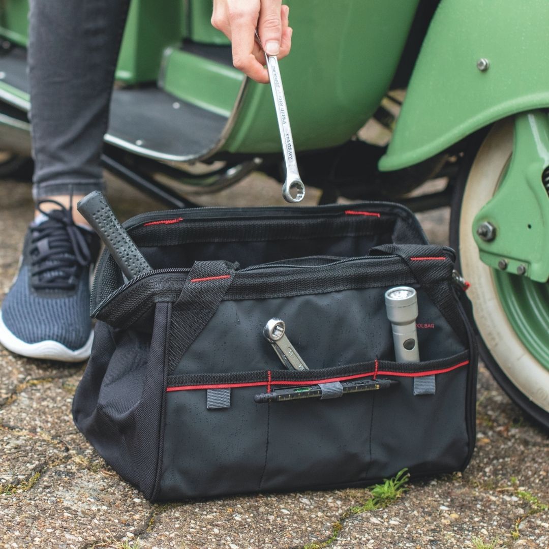 Troika has created a Tool bag with carrying handle that is right sized for most people. It features a stiffened zipper and an extra wide opening for easy access to a spacious main compartment. The main compartment of the bag has 6 slide pockets to organize tools. The outside front of the bag has 3 slide pockets with 3 pen loops. The bag has great strength for its size with a load capacity up to 22 Lbs. Total capacity is 1.75 gallons. The bags Tarpaulin material is tear resistant and washable. Black with red accents.